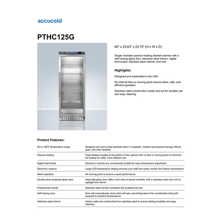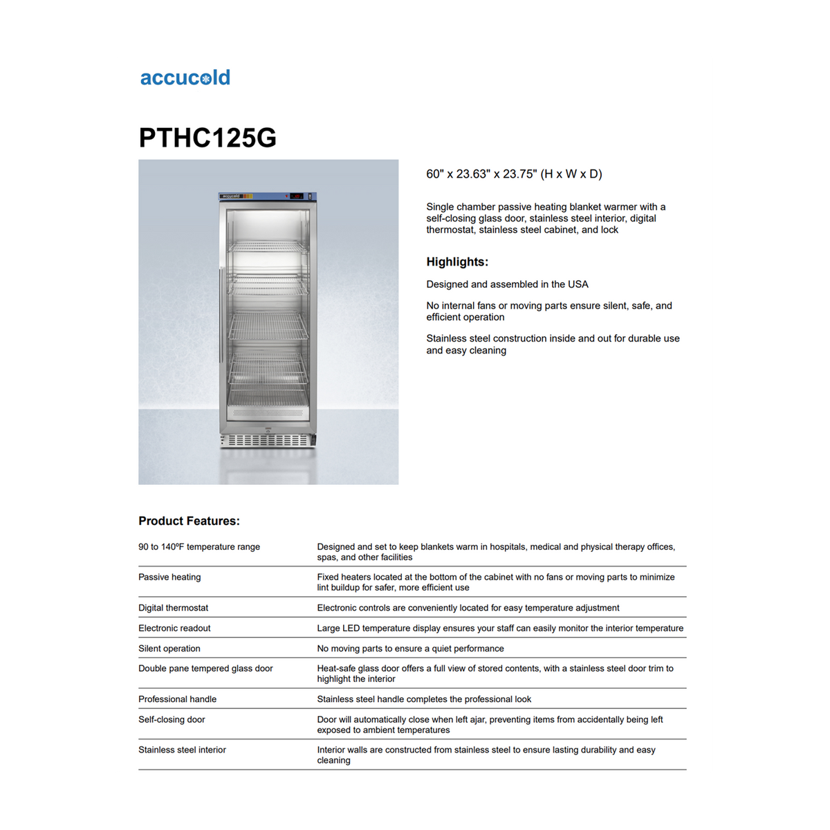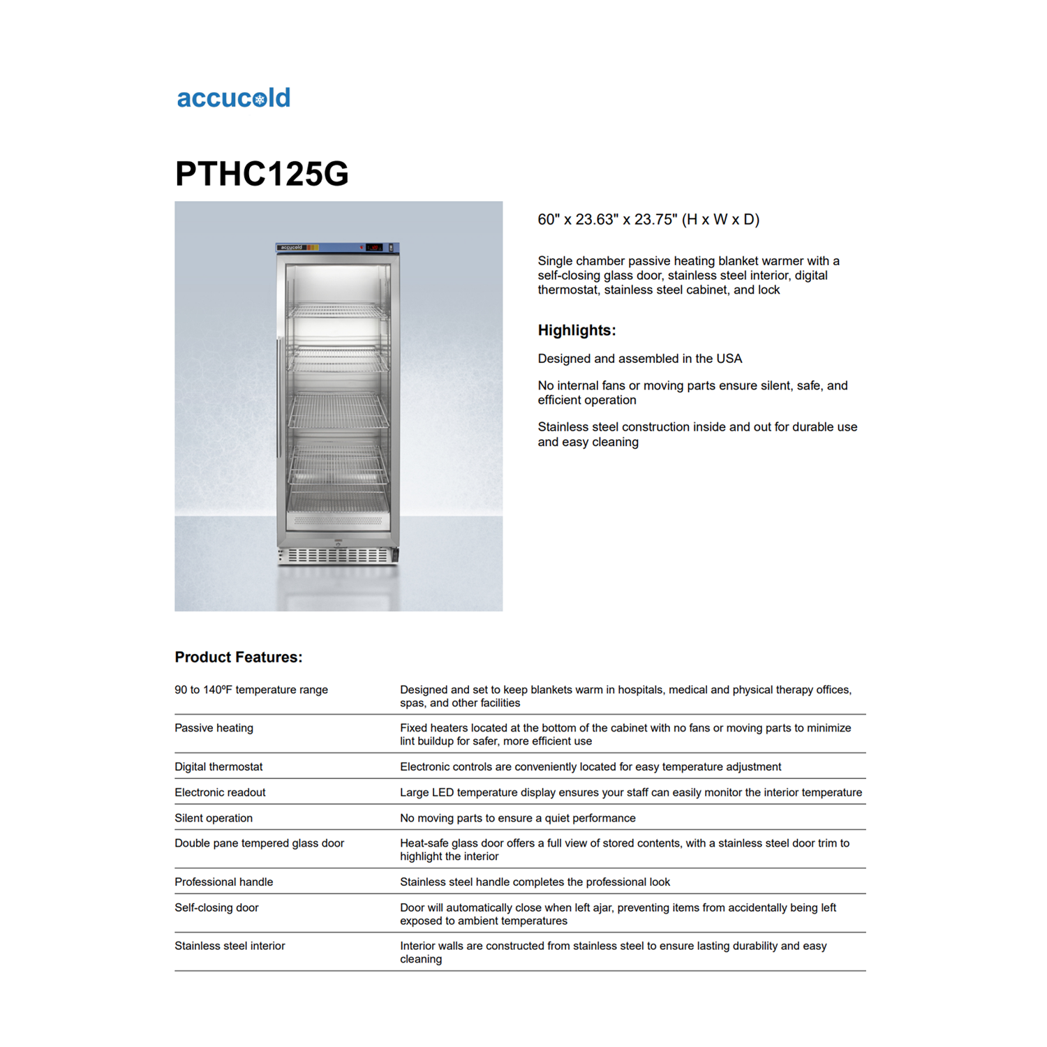 The PTHC125G, with its slim design and intuitive features, is an excellent solution for ensuring the proper care of blankets in hospitals, medical and physical therapy offices, wellness centers, spas, and beyond.
