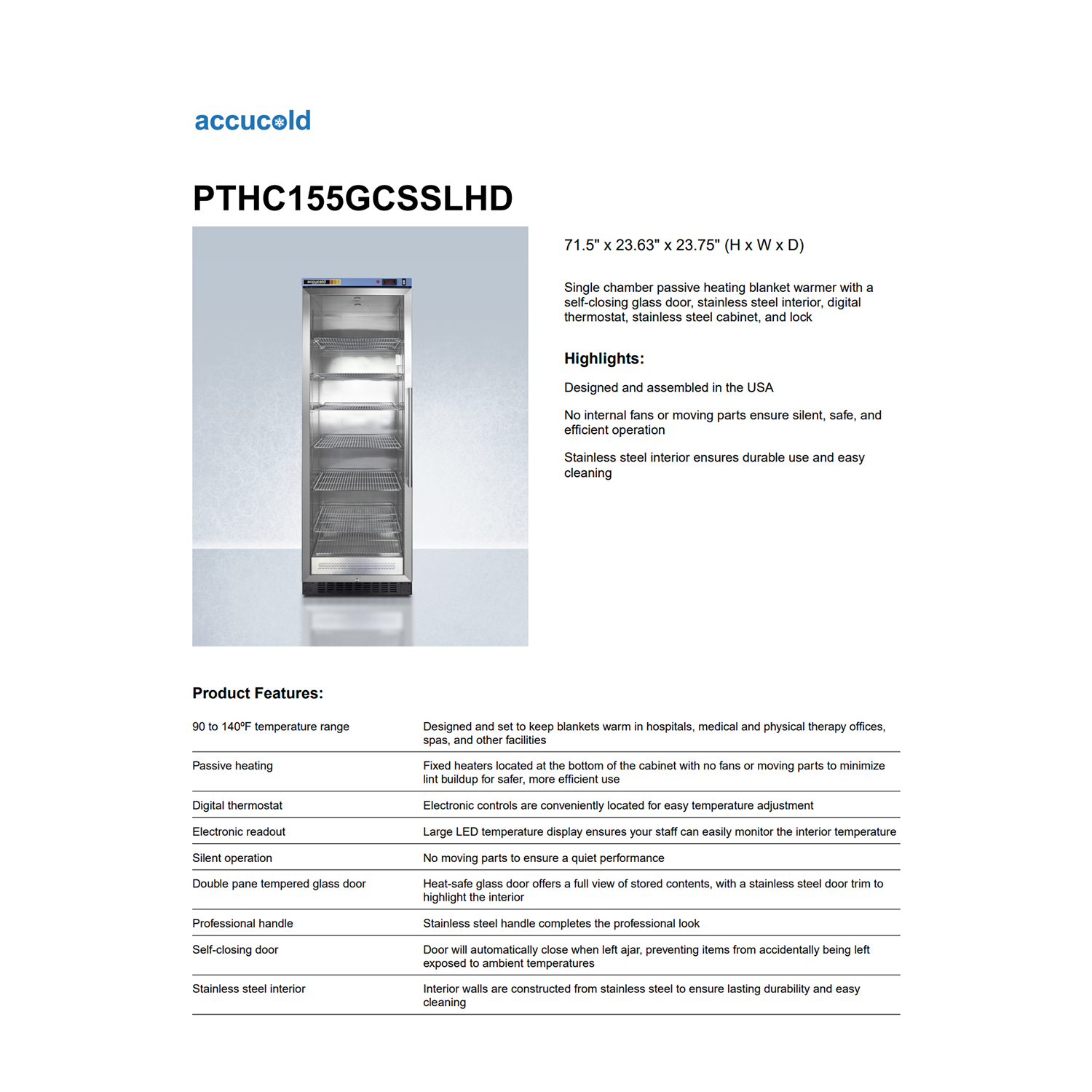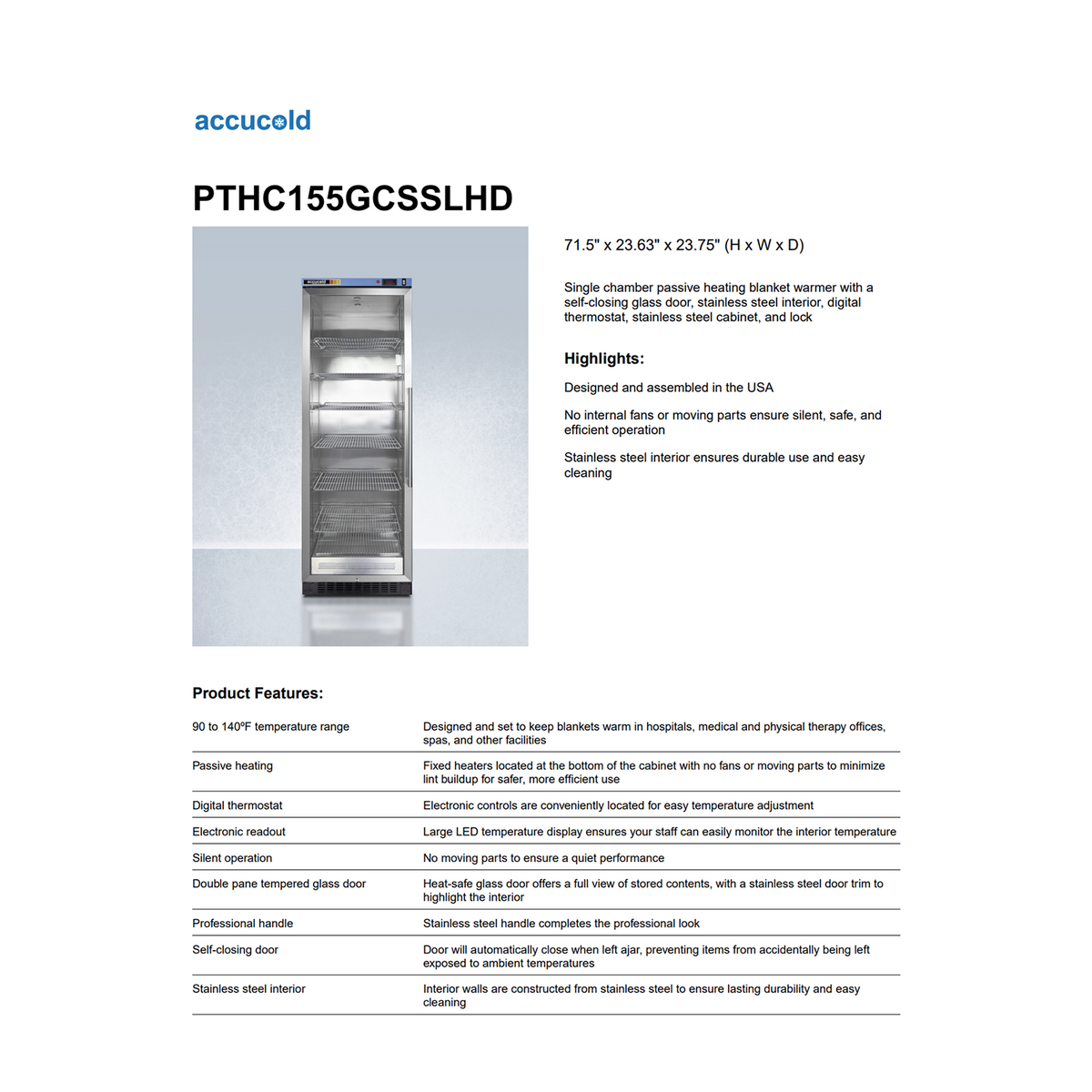 The PTHC155G is a single-chamber blanket warmer that is perfectly suited for hospital use, maintaining blankets at the desired temperature. It boasts a double-pane, tempered, self-closing glass door with a right-hand swing and a professional-style handle for user convenience. The interior is made from stainless steel, making it easy to clean and durable over time. This unit operates within a temperature range of 90º to 140ºF, thanks to its foamed-in-place insulation, ensuring efficient heat retention. A digital thermostat with a large LED display allows for precise temperature control, and the unit's cantilevered shelving system comes with six chrome shelves that can be adjusted to accommodate various storage requirements.