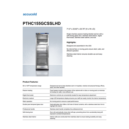 The PTHC155G and PTHC155GCSS are both warming cabinet models designed to meet the needs of healthcare environments. The PTHC155G model features a black cabinet, but for those who prefer a different aesthetic, it is also available in a stainless steel finish as the PTHC155GCSS. Each model is equipped with a factory-installed lock on a door trimmed in stainless steel, enhancing security, and comes with a hospital-grade 'green dot' plug to ensure safety in areas with frequent foot traffic. To facilitate ease of movement and simplify cleaning, there is an optional dolly (DollyPHC) tailored for these units.