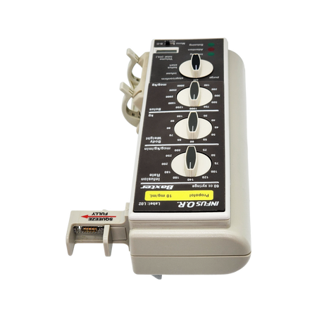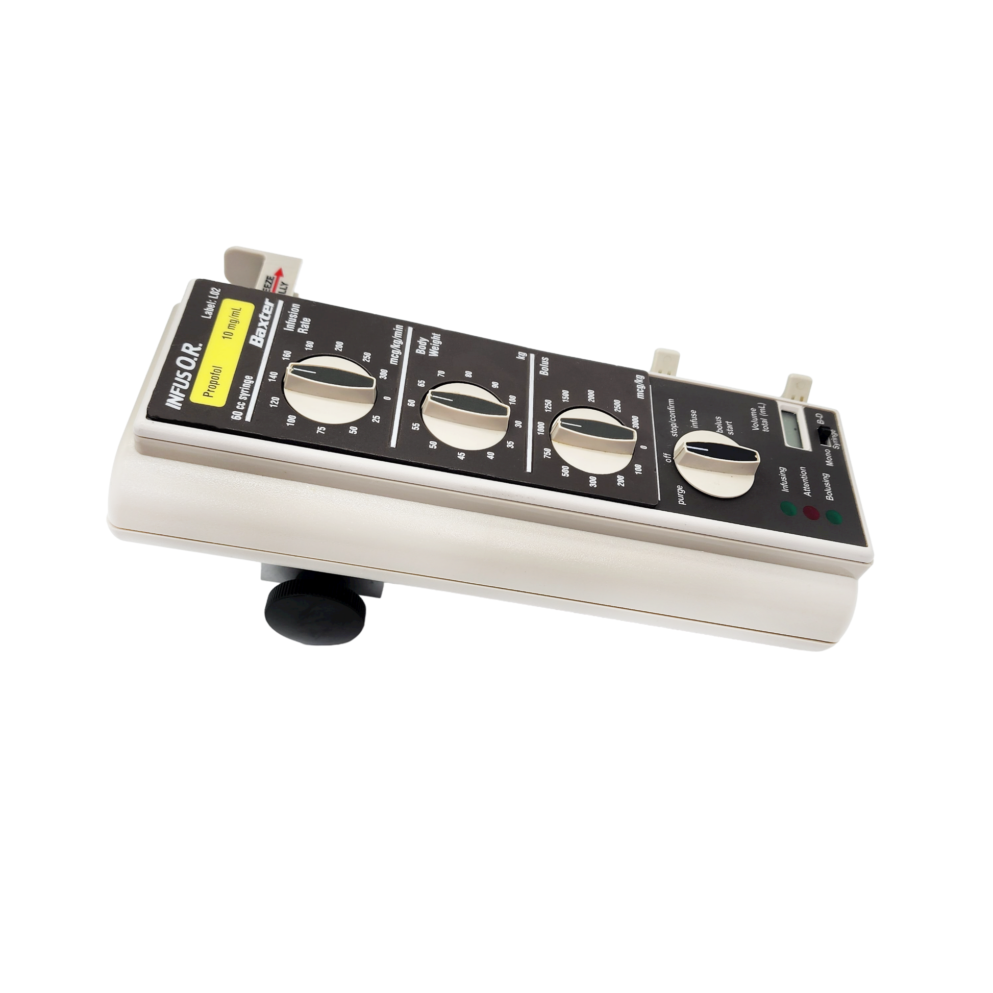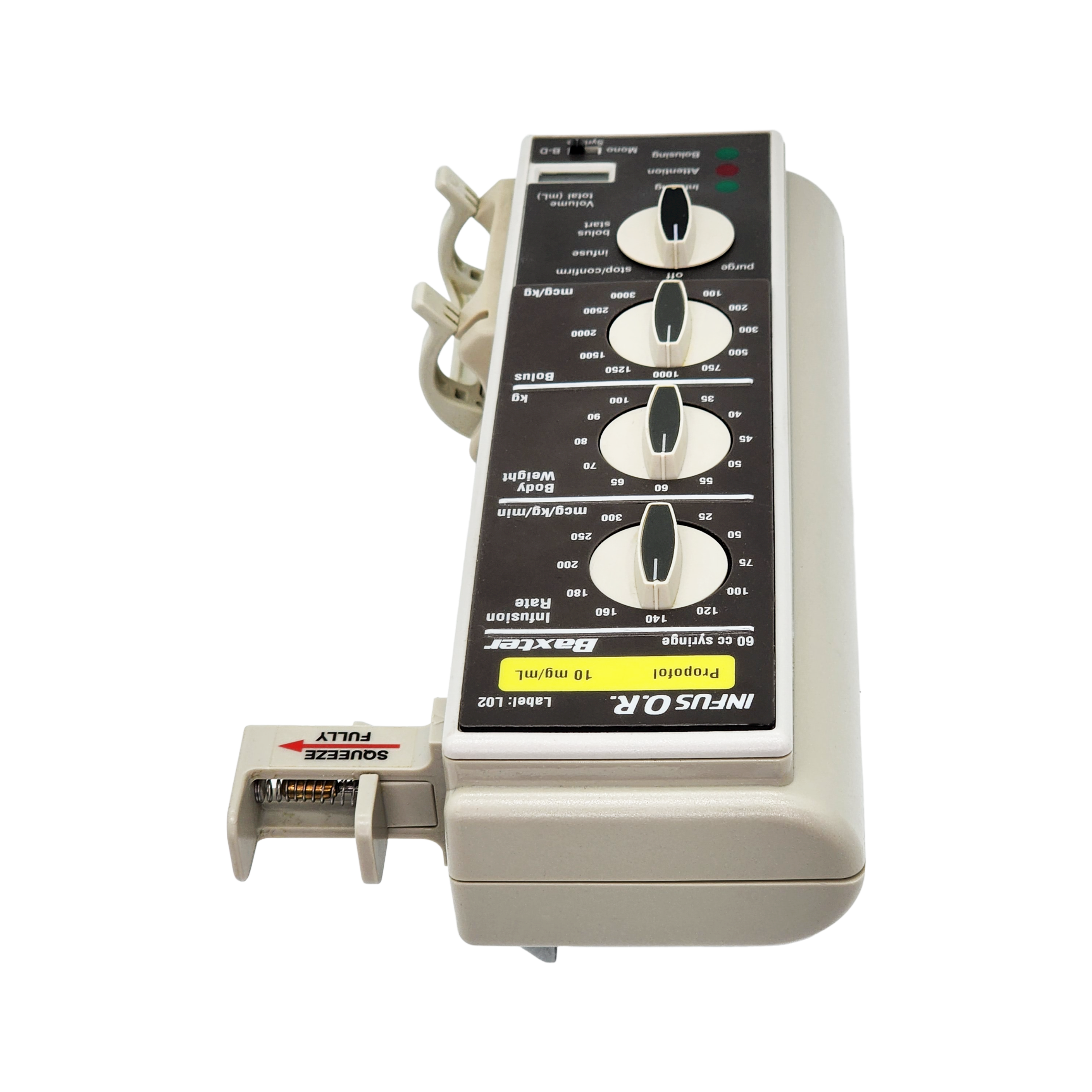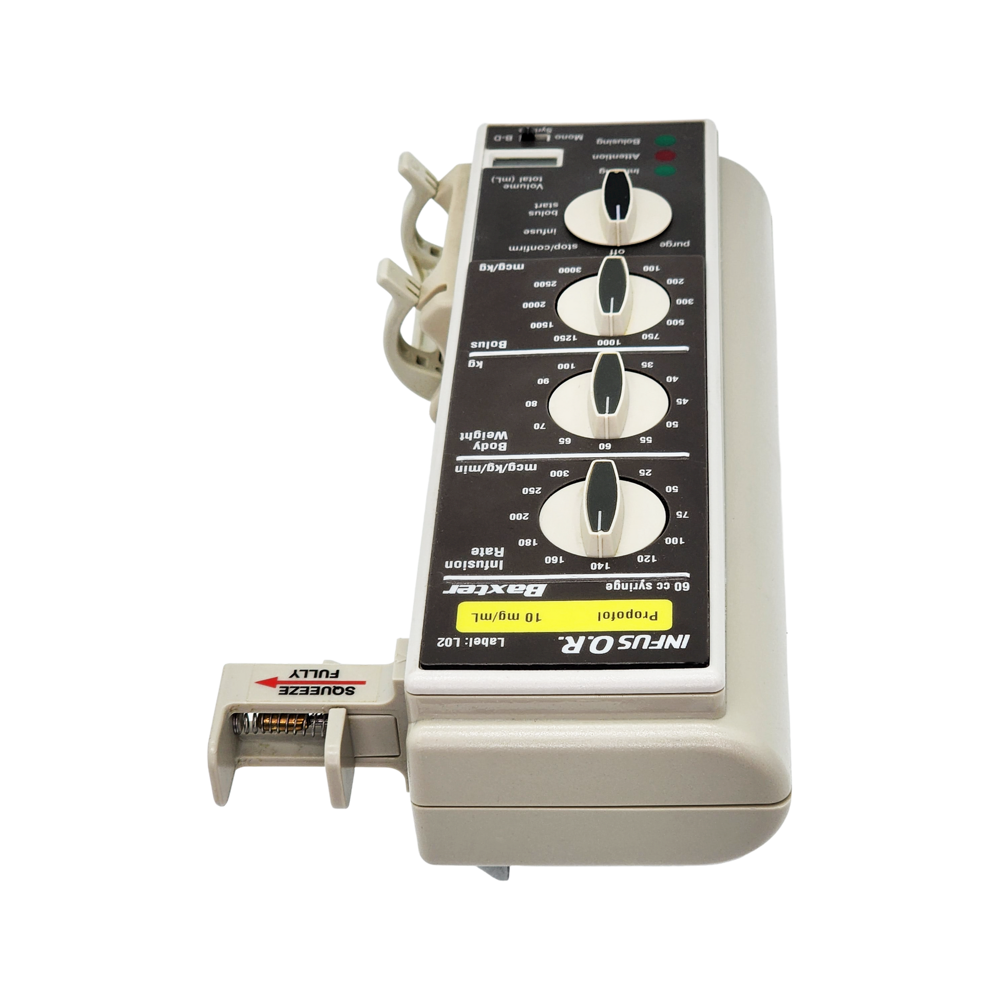 The Baxter Bard Infus O.R. Pump is a syringe infusion device that will aid in the administration of many intravenous agents given during anesthetic procedures. It provides for the convenient delivery of narcotics, muscle relaxants, and vasoactive drugs through the SMART LABEL System and is an excellent device for outpatient surgical settings.