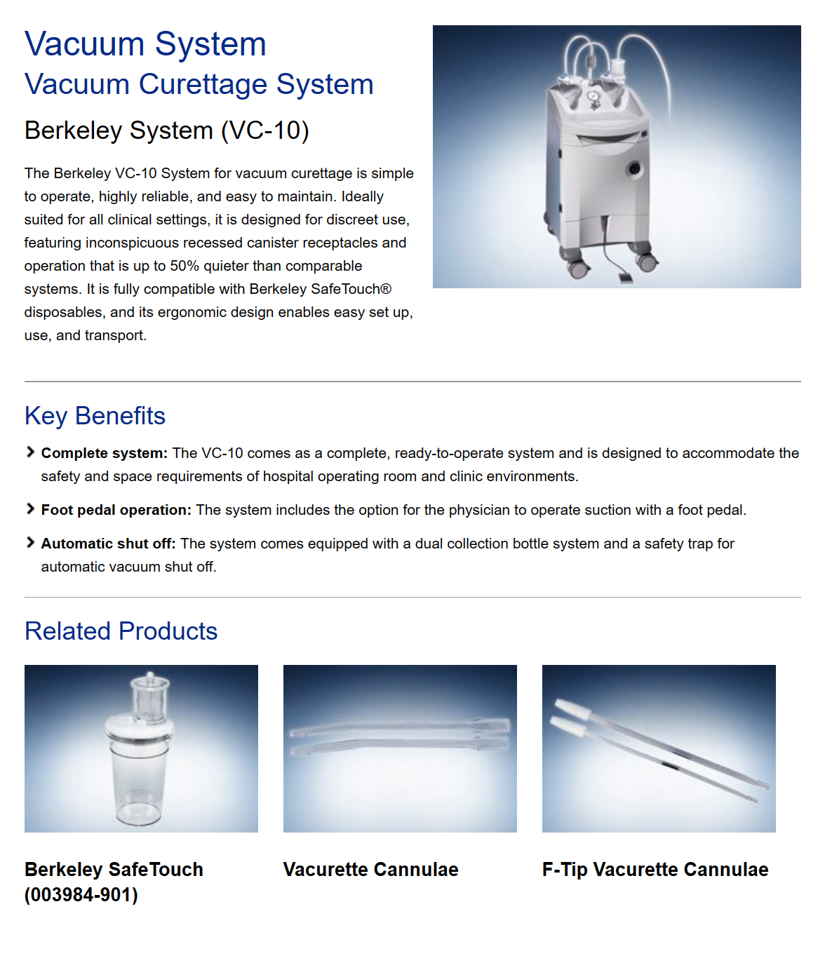 The Berkeley VC-10 System for vacuum curettage is designed to be user-friendly, reliable, and low-maintenance. It is suitable for various clinical settings and is discreetly designed, featuring recessed canister receptacles and operation that is up to 50% quieter than comparable systems. The system is fully compatible with Berkeley SafeTouch® disposables and is ergonomically designed for easy setup, use, and transport. Additionally, it comes as a complete, ready-to-operate system and is designed to accommodate the safety and space requirements of hospitals.