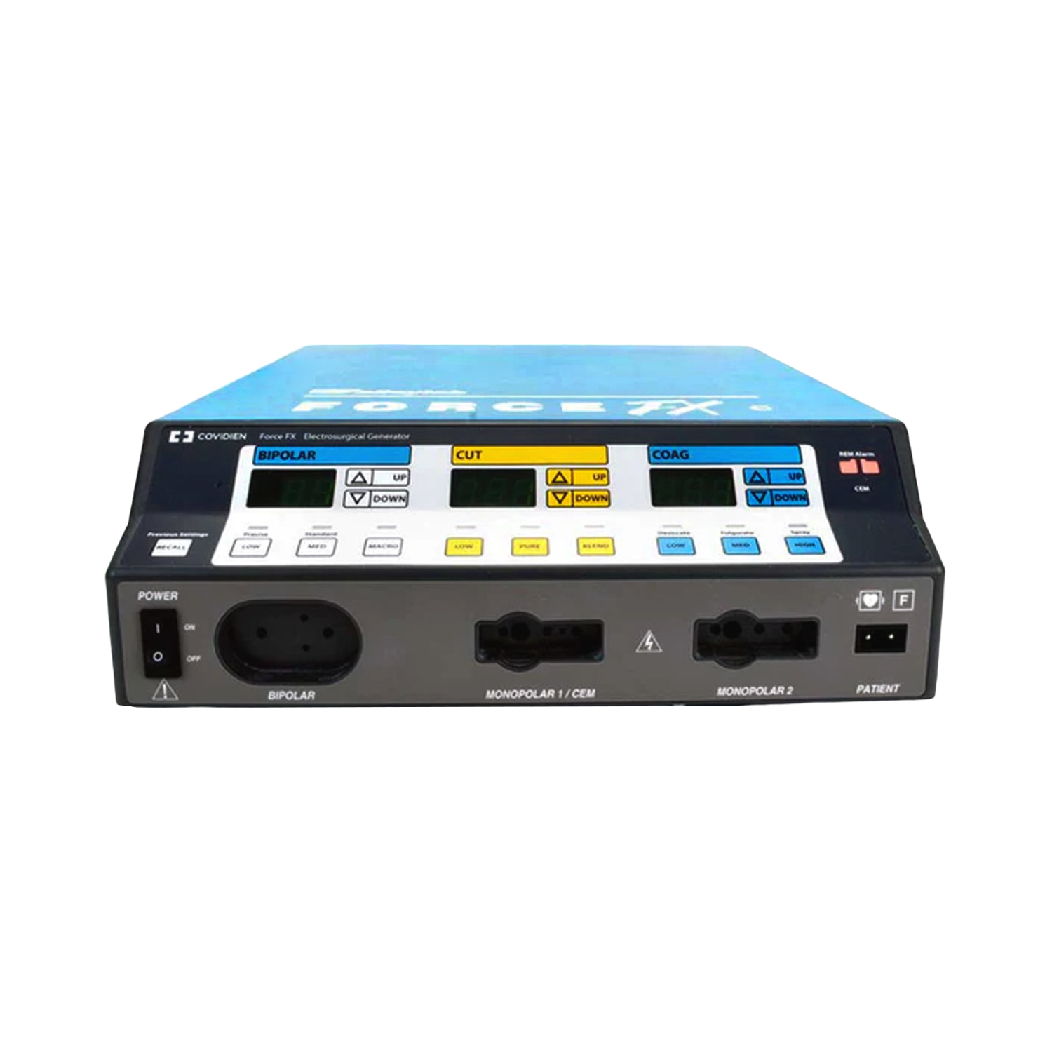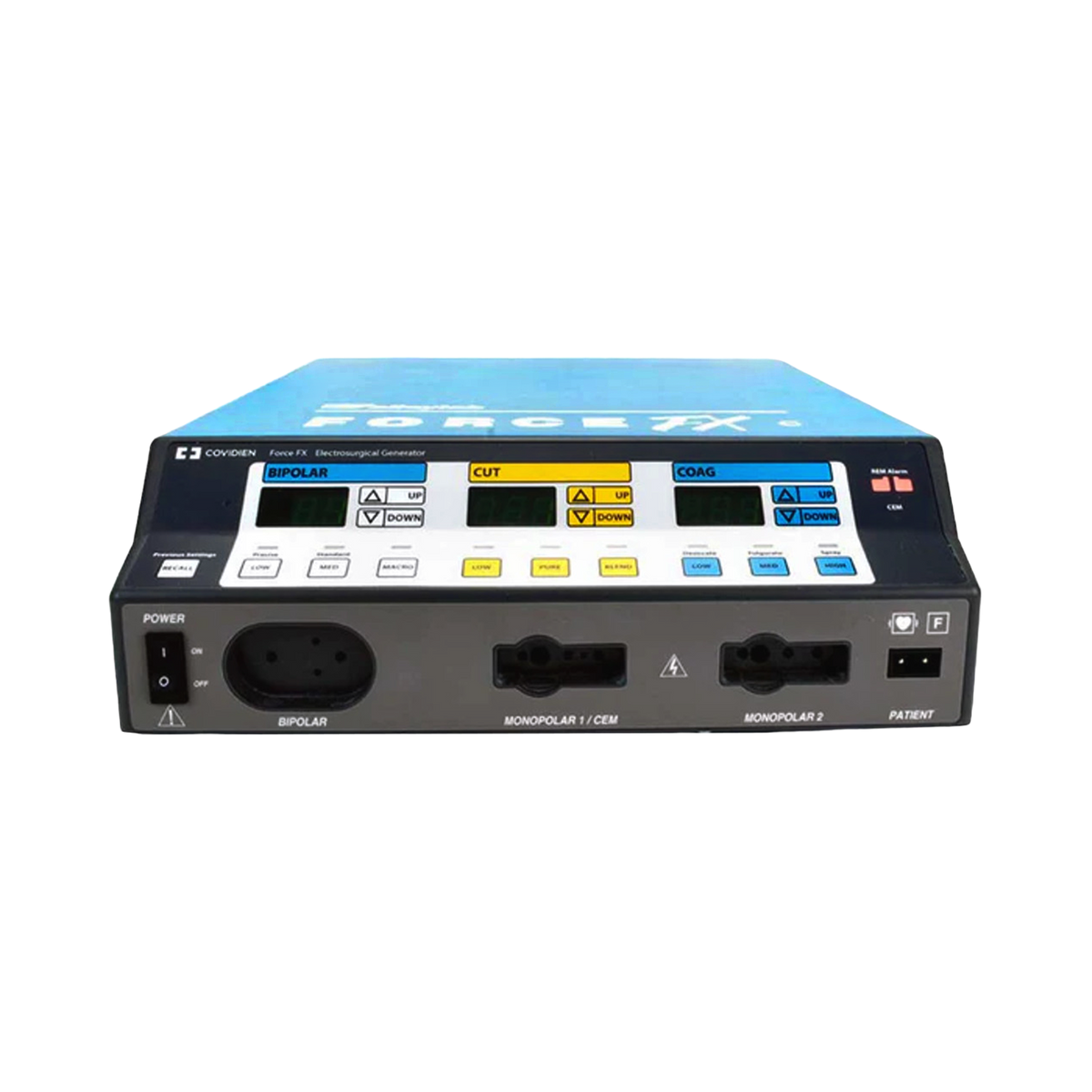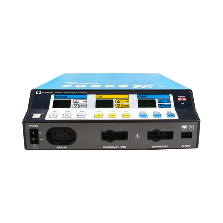 The Covidien Force FX-C is an advanced electrosurgical generator known as the "Covidien Force FX electrosurgical generator C". This device is specifically designed to provide isolated output power for cutting, desiccating, and fulgurating tissue during both bipolar and monopolar surgeries. It incorporates innovative technology to automatically detect resistance levels and adapt the output voltage accordingly, ensuring a consistent effect across various tissue densities. This unique adjustment feature is exclusive to bipolar or cut modes and is dependent on the power setting and tissue resistance level. The Covidien Force FX-C offers three distinct bipolar modes, three monopolar cut modes, three monopolar coagulation modes, and enables simultaneous coagulation. Moreover, the Covidien Force ESUs are fully compatible with the CUSA System 200, CUSA EXcel+, and CUSA handpieces, allowing seamless integration with the CUSA electrosurgical module.