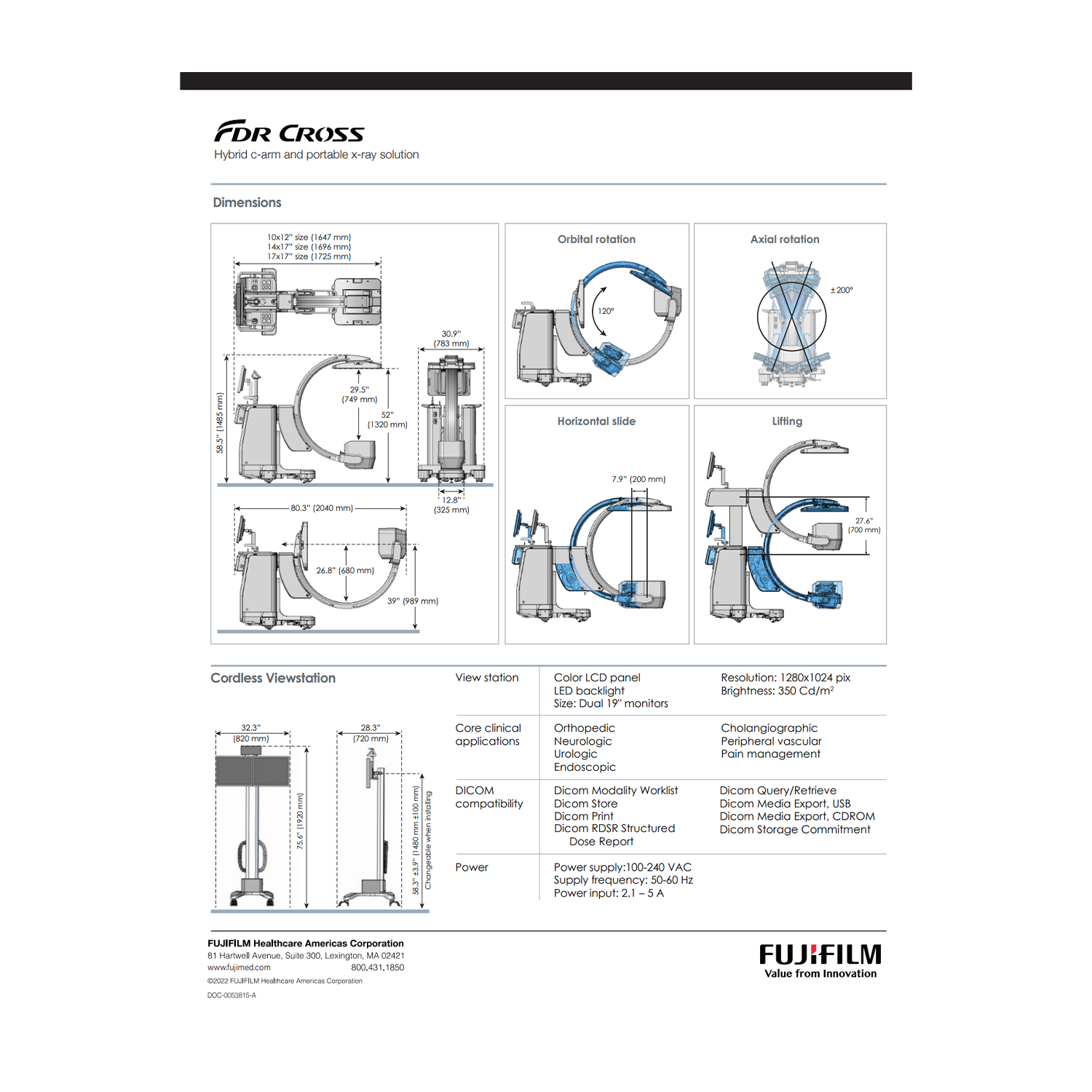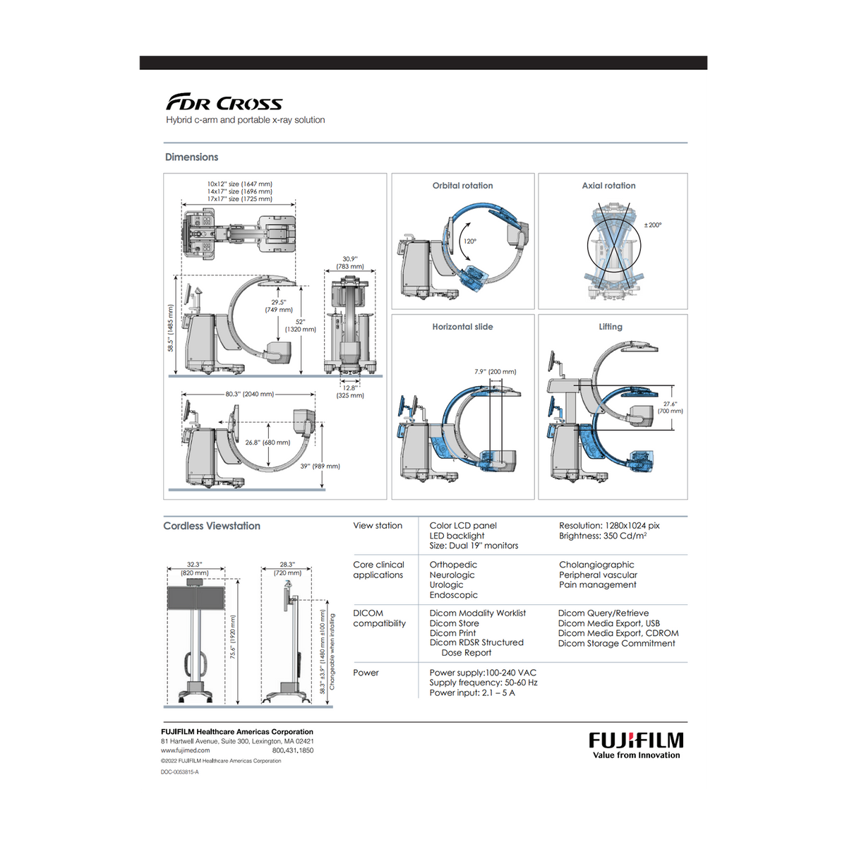 Featuring a design that supports flexible positioning, the Fuji FDR Cross excels in generating detailed radiographic images, matching and often surpassing the capabilities of standard portable x-ray units. Ideal for use in emergency settings, intensive care, or during operations, the Fuji FDR Cross represents the pinnacle of c-arm technology.