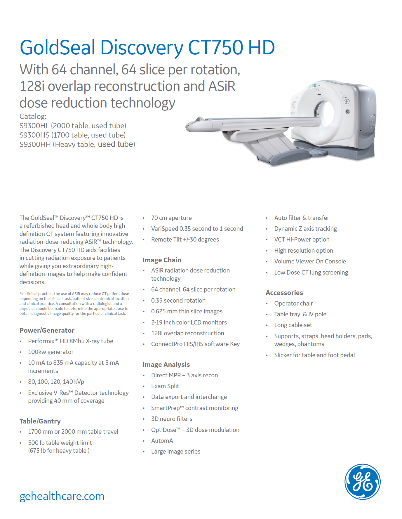 The GoldSeal™ Discovery™ CT750 HD is a head and whole-body high-definition CT system that incorporates innovative ASiR™ technology to reduce radiation dose. This technology enables healthcare facilities to minimize patient radiation exposure while delivering exceptional high-definition images. The system is designed to provide ultra-precise information on even the smallest structures, and it features a small footprint, making it suitable for state-of-the-art medical facilities. Additionally, the CT system offers fast volumetric scanning, lower dose with optimized contrast use, and the ability to be upgraded to a 160mm detector coverage system, allowing for scalability and enhanced clinical capabilities.