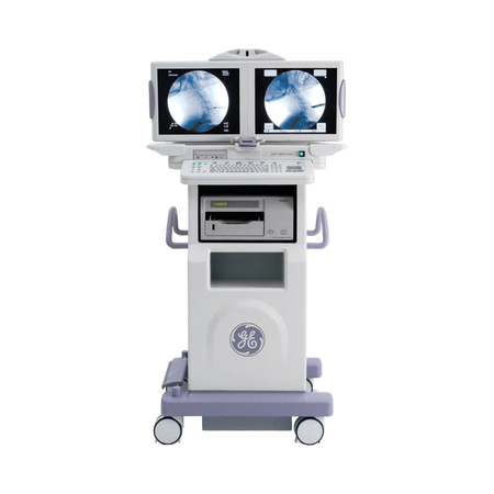 The GE OEC 9900 Elite C-arm offers enhanced image quality and monitoring. It is capable of performing DSA (Digital Subtraction Angiography) while moving the c-arm or the patient. The system features an easy-to-use interface, a deeper arch for better access to the patient during specific procedures, and applies algorithms and preprogrammed bandwidths to improve image accuracy and definition. The 9900 Elite is equipped with a dual flat panel and touchscreen monitor, allowing for easy maneuvering to view images from any angle.