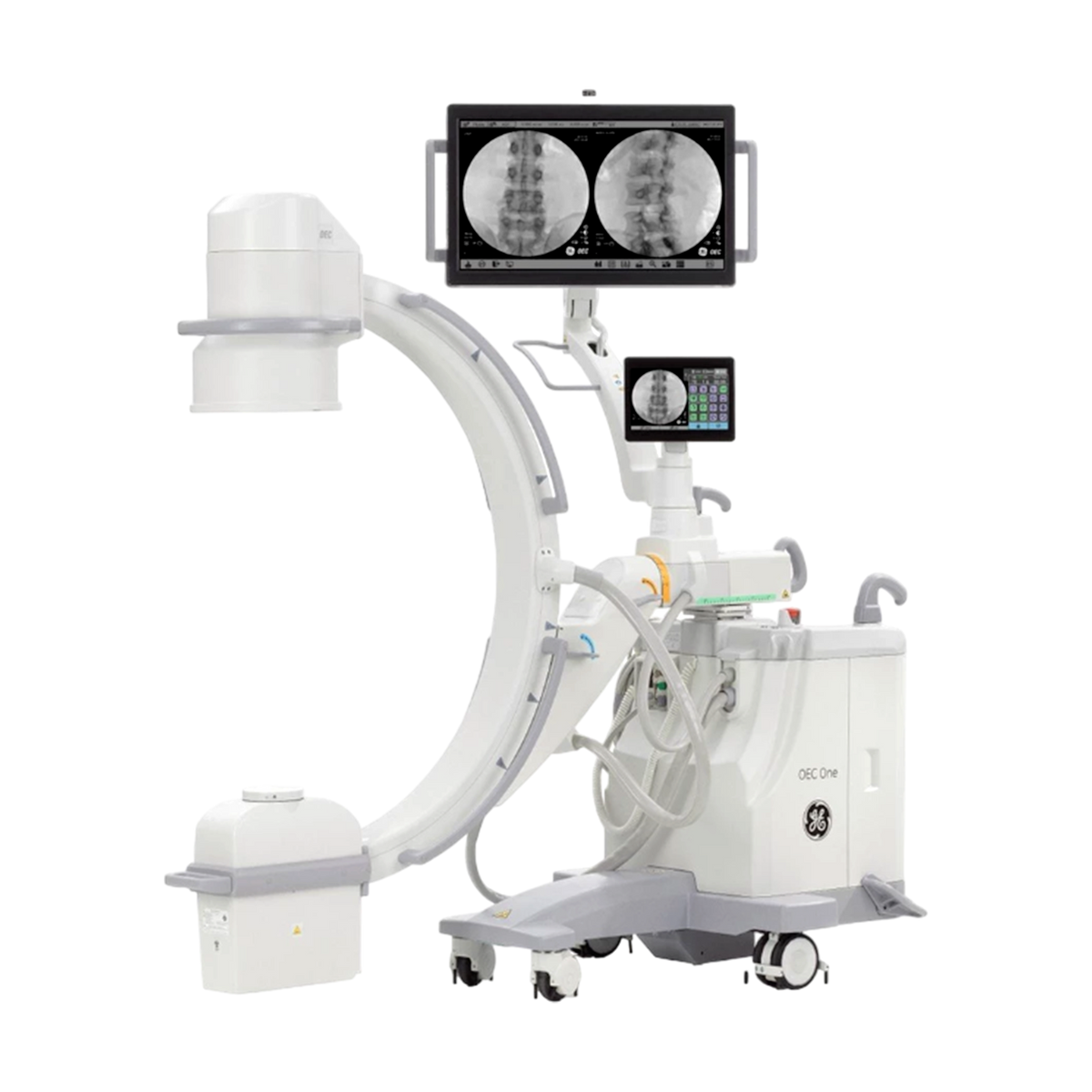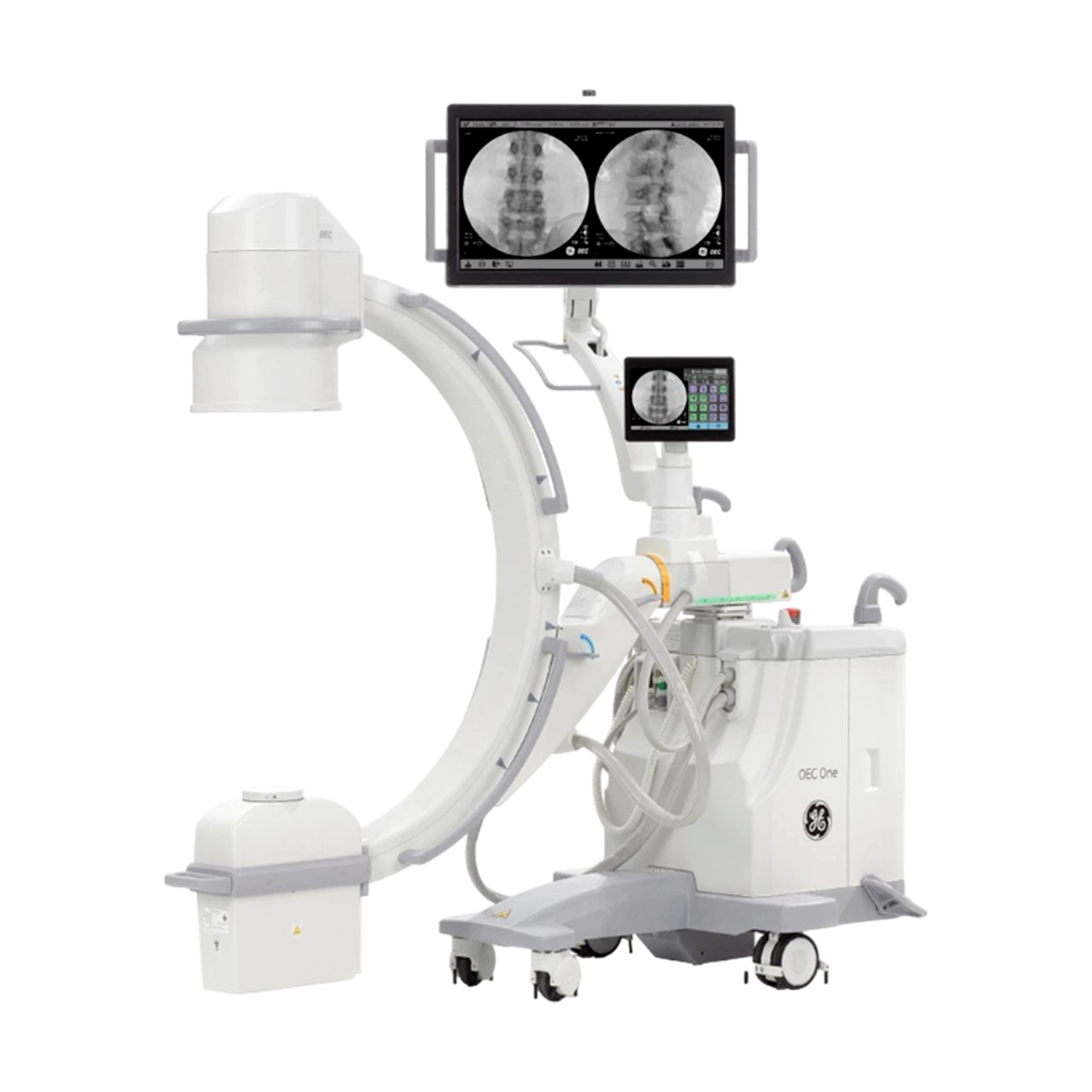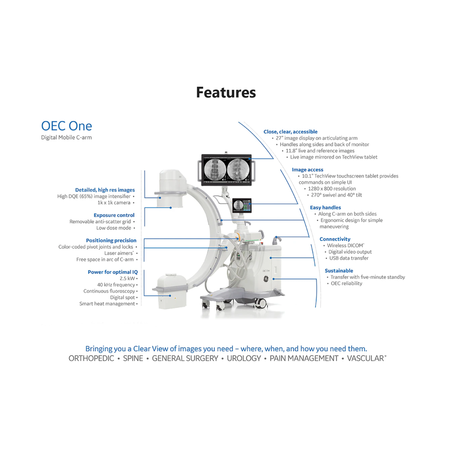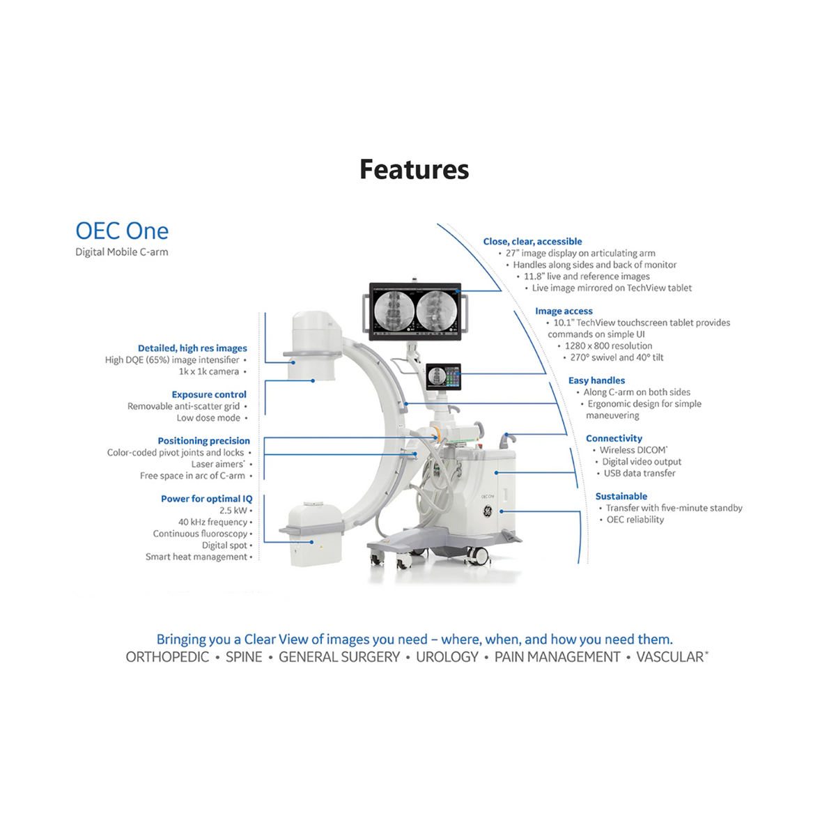 The GE Healthcare OEC One is a comprehensive C-arm system designed to deliver high-quality, Clear View images tailored to the user's needs in various clinical settings. It offers enhanced visibility and the ability to quickly adjust images on the fly.