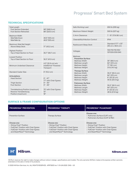 The Hillrom P7500 Progressa Intelli Drive Hospital ICU Rotation P&V Pulmonary Bed (Model P7500) is a versatile and advanced hospital bed system designed to provide exceptional care for patients and clinicians. Here are some key features and information about the Hillrom Progressa Bed based on the search results: