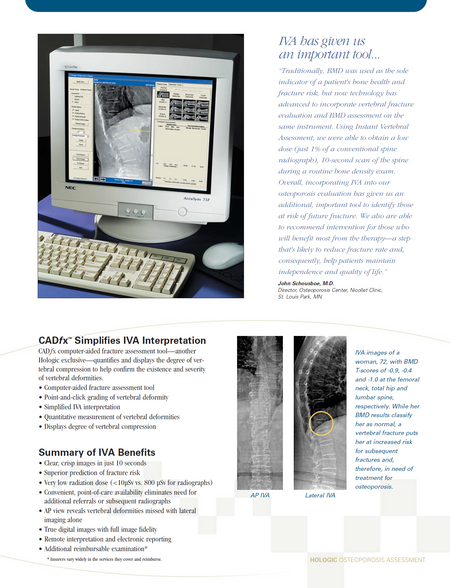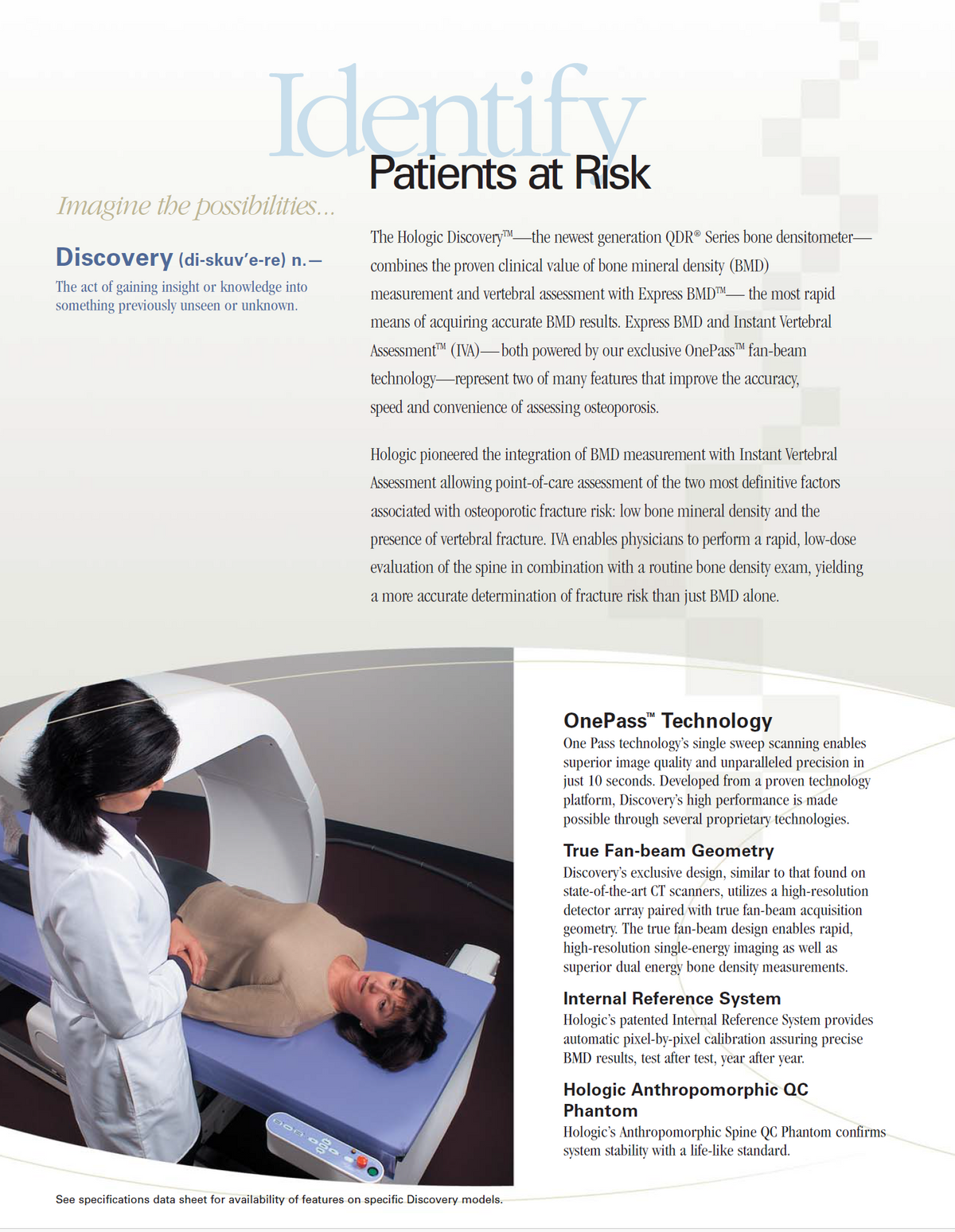 Hologic has been at the forefront of dual x-ray (DXA) bone densitometry technology, which has now become the gold standard for assessing bone health and determining osteoporosis risk. The Discovery™ system, developed by Hologic, is a pioneering solution that equips clinicians to identify fractures that might not be apparent through physical examination alone. It provides valuable data on basic bone mineral density and the patient's T-score.