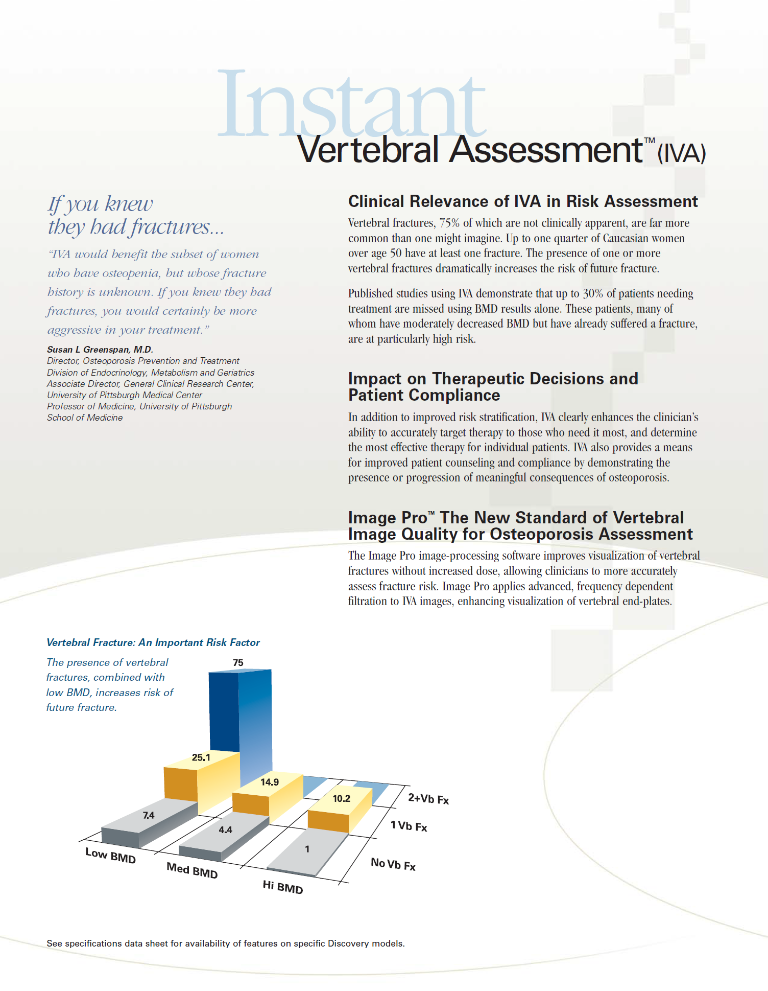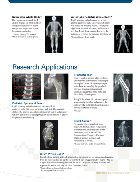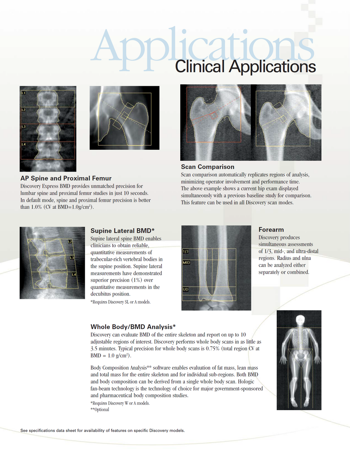Furthermore, the Discovery™ system offers a range of advanced applications. High Definition Instant Vertebral Assessment™ (IVA™-HD) delivers high-resolution images for evaluating vertebral fractures and visualizes the abdominal aorta to assess calcifications (AAC). It also includes FRAX® fracture risk assessment and Advanced Body Composition™ assessment, featuring InnerCore™ visceral fat evaluation. These capabilities offer clinical practitioners a comprehensive overview of factors like fat mass, lean mass, and visceral fat, which can serve as vital indicators for assessing cardiovascular risk and other metabolic conditions.