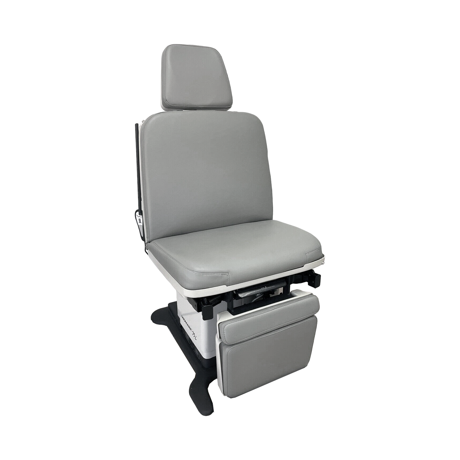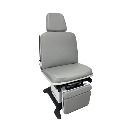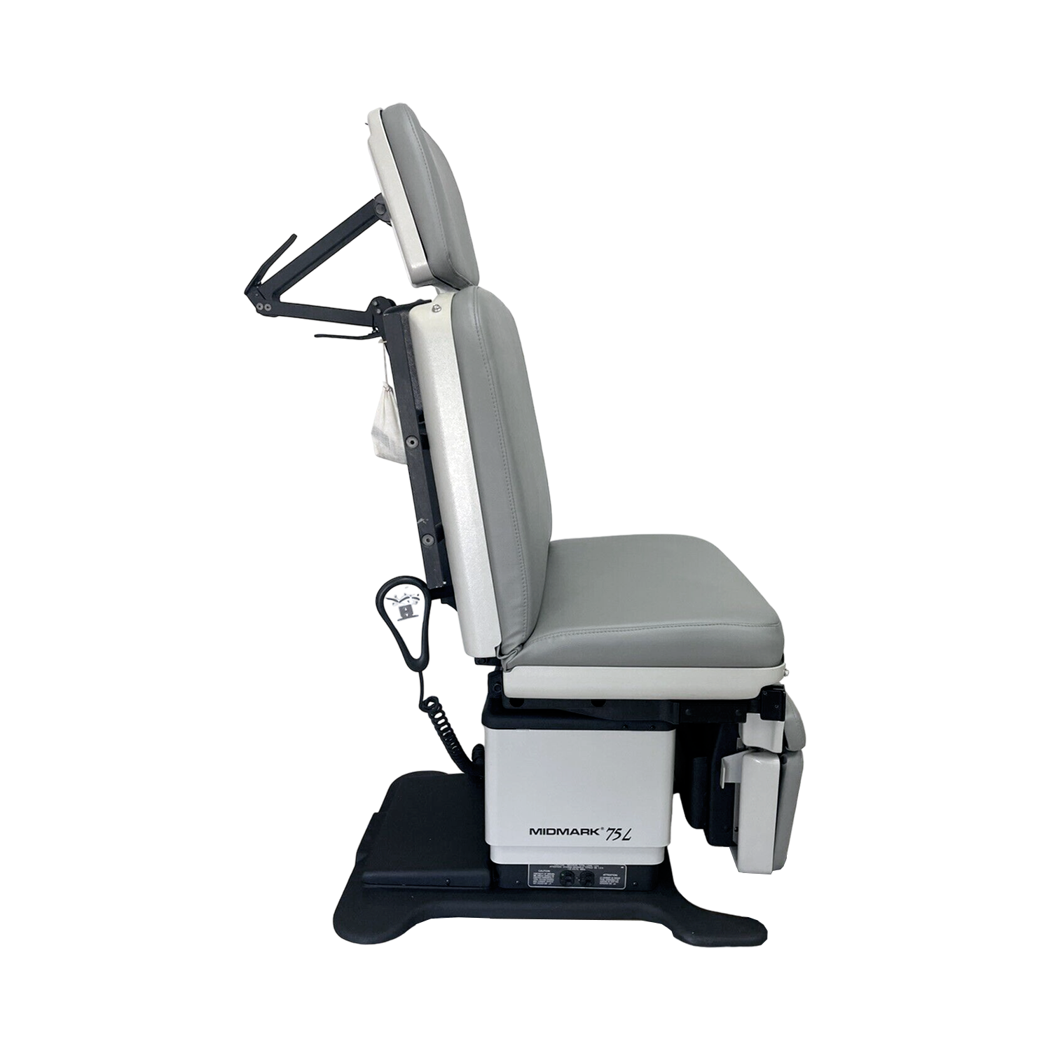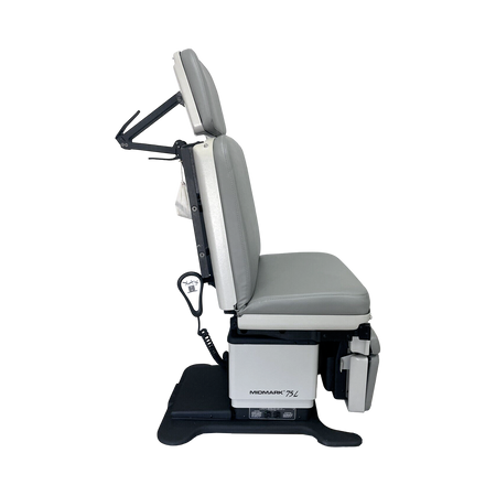 The Midmark Ritter 75L chair is notable for its exceptionally low minimum height of 22.5 inches, ensuring easy and safe access for patients when getting on and off the chair. The power chair is equipped with an 8-way footswitch or hand control for seamless operation, along with additional features such as an accessory side rail, paper holder, and an articulating headrest. The Midmark Ritter 75L also includes a convenient pull-out drain pan at the seat section's end and pull-out heel stirrups. Furthermore, the foot/leg rest section is lockable in four positions, providing versatility for proctology chair configurations.