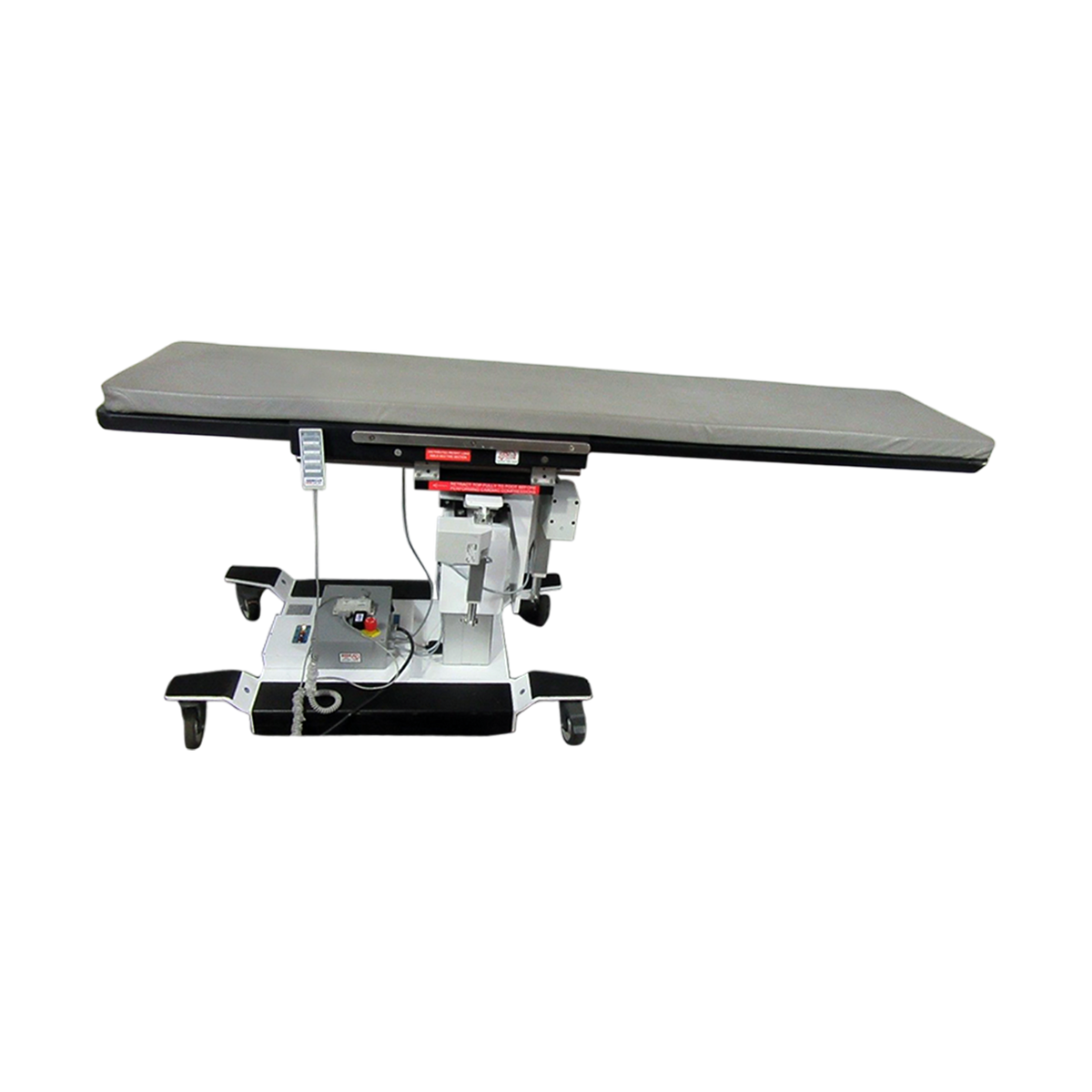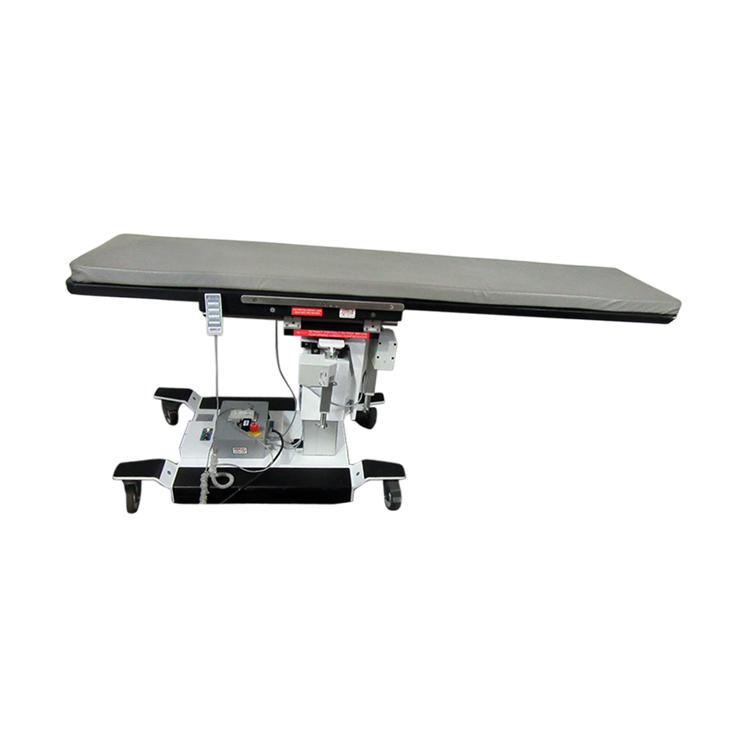 The Morgan MEDesign Positioner Pro Series Model FLTLT-FW is a C-Arm table designed for pain management and various medical procedures. It offers features such as stability in lifting, tilting, and extensions for C-Arm functions, a radiolucent tabletop, wireless and wired hand-held motion control, a deluxe table top pad, a padded safety strap, and a rectangular-shaped radiolucent carbon-fiber composite top. The table provides height adjustment, with options for 4 motions ranging from 31" to 39" and 5 motions ranging from 35" to 44".