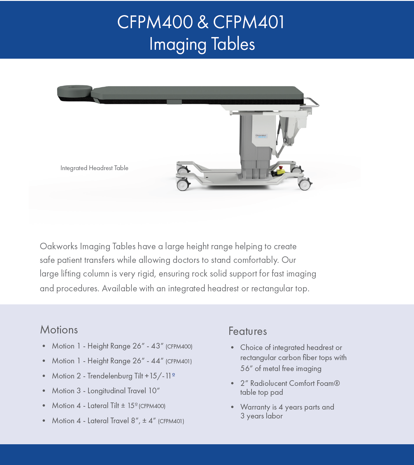 The CFPM401 is an Imaging/Pain Management Table manufactured by Oakworks Medical. It features a large adjustable height range, a 56-inch metal-free imaging space, and a 500 lb. patient weight capacity. The table is designed for image-guided procedures, providing stability, access, and precise positioning. It is available with an integrated headrest or a rectangular top, and it offers four movement options for cost-effective functionality and efficient patient care.