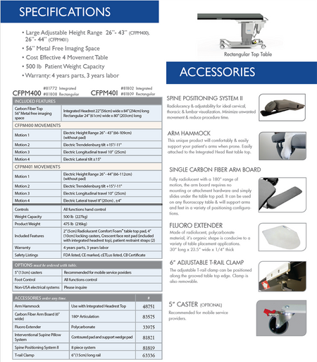 - Included Features - 2 in. (5cm) Radiolucent Comfort Foam® table top pad, 4 in. (10cm) locking casters, Crescent face rest pad (included with integrated headrest top), patient straps (2)