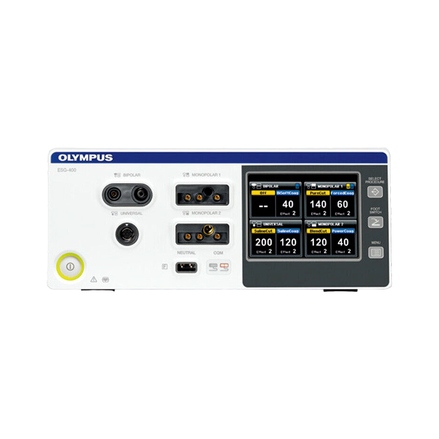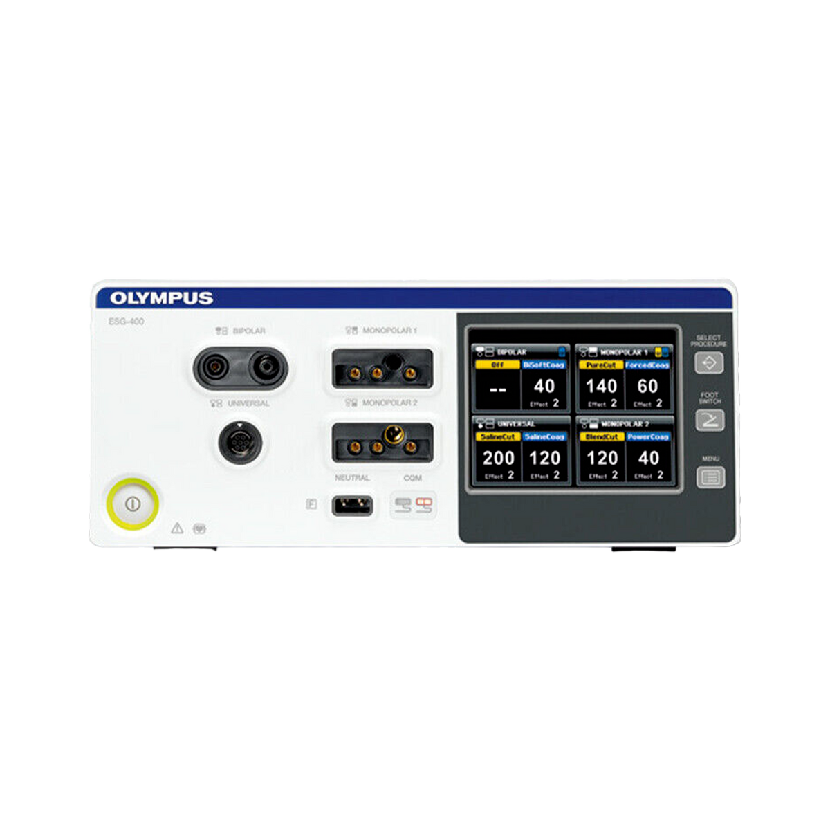 The Olympus THUNDERBEAT ESG-400 Electrosurgical Generator provides a wide range of surgical energy options, including monopolar, bipolar, and advanced bipolar modes, catering to various surgical needs in open, laparoscopic, and endoscopic procedures.