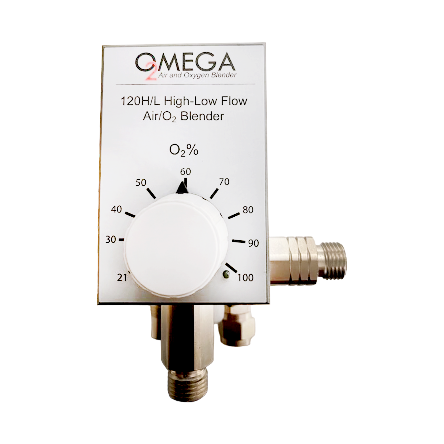 Blend Air and Oxygen with Omega’s O2 Blender: The 120H/L Flow O2 Blender mixes medical grade compressed air and oxygen to provide a pressurized gas source ranging from 21% to 100% oxygen.