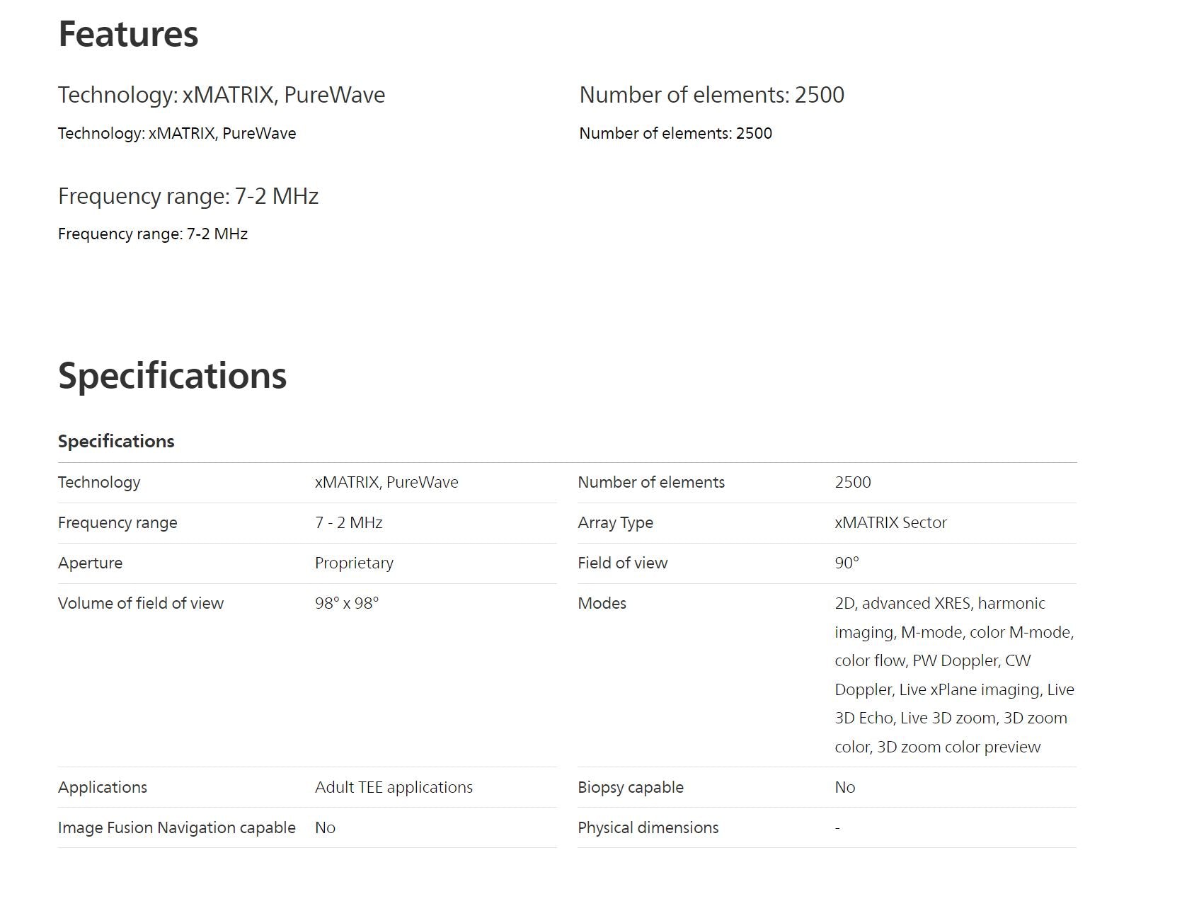 - Modes: 2D, advanced XRES, harmonic imaging, M-mode, color M-mode, color flow, PW Doppler, CW Doppler, Live xPlane imaging, Live 3D Echo, Live 3D zoom, 3D zoom color, 3D zoom color preview