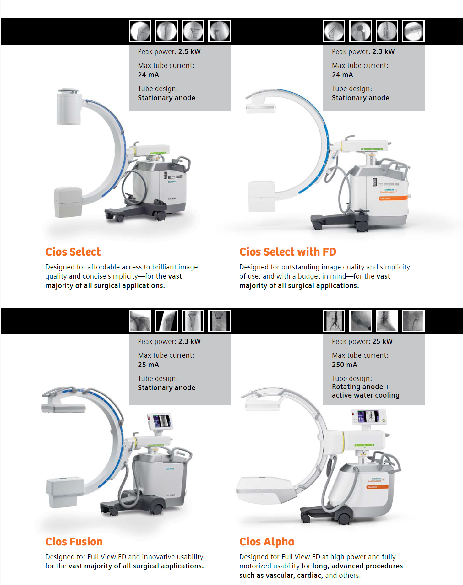 The Siemens Cios Select is a mobile C-arm system designed to provide high-quality imaging for various medical procedures. It offers advanced features such as Full View FD technology, a large field of view, and a square FD image that provides 25% more coverage than conventional image intensifiers.