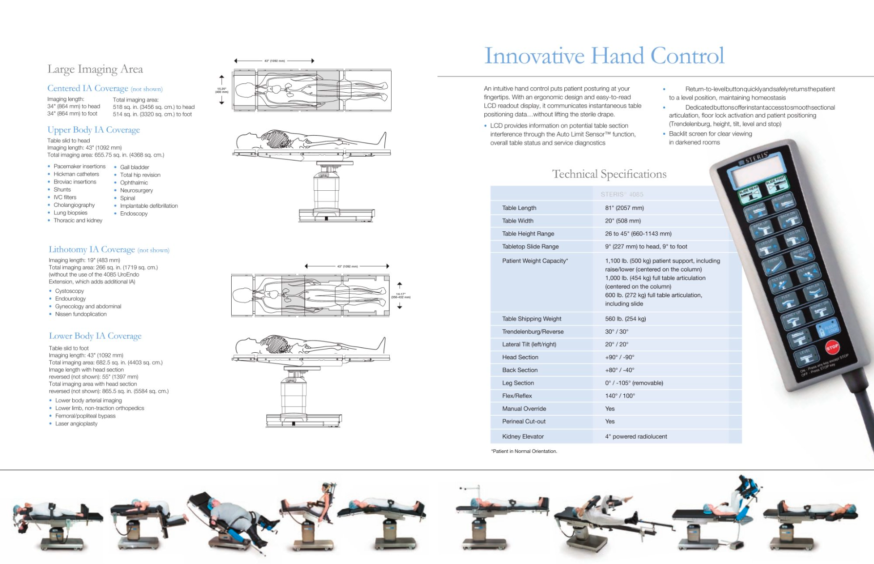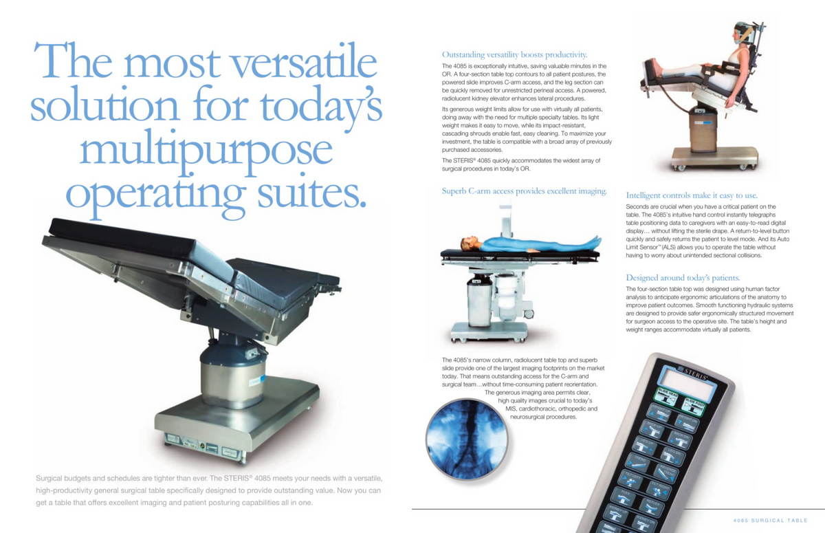 The STERIS 4085SP Surgical Table is a versatile and durable surgical table suitable for a wide range of surgical procedures. It comes with a removable headrest unit, a removable pendant hand control unit, and a set of tabletop cushions. With a weight capacity that allows for use with virtually all patients, it eliminates the need for multiple specialty tables. The table is compatible with a broad array of previously purchased accessories, maximizing its versatility and functionality. It provides outstanding access for C-arm, allowing for high-quality images crucial to cardiothoracic, orthopedic, and neurosurgical procedures. The table features a four-section tabletop that contours to all patient postures, a powered slide to improve C-arm access, a removable leg section for unrestricted perineal access, and a powered, radiolucent kidney elevator to enhance lateral procedures.