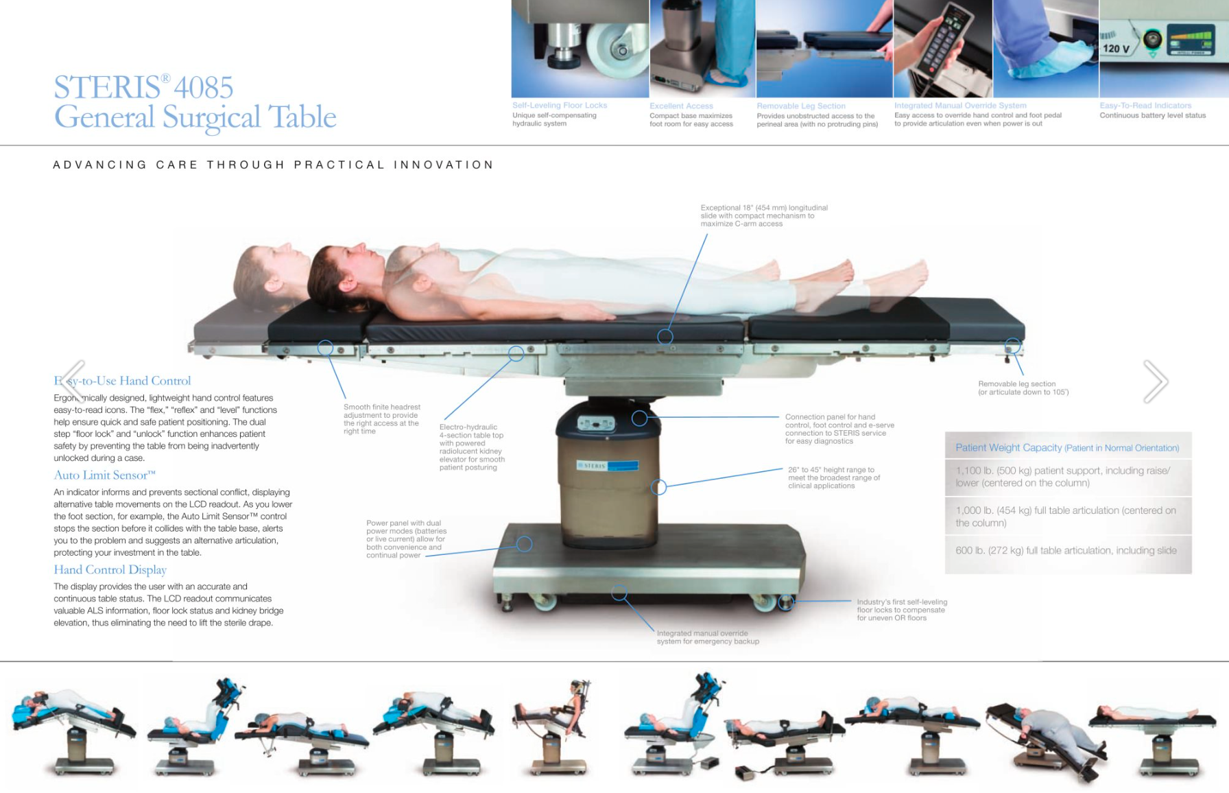 Additionally, it is equipped with a return-to-level button, an Auto Limit Sensor (ALS) to operate the table without unintended sectional collisions, and an intuitive hand control that instantly telegraphs table positioning data to caregivers. The table's smooth functioning hydraulic system is designed to provide safer, ergonomically structured movement for surgeon access to the operative site. The STERIS 4085SP Surgical Table is a reliable and cost-effective solution for various surgical specialties.