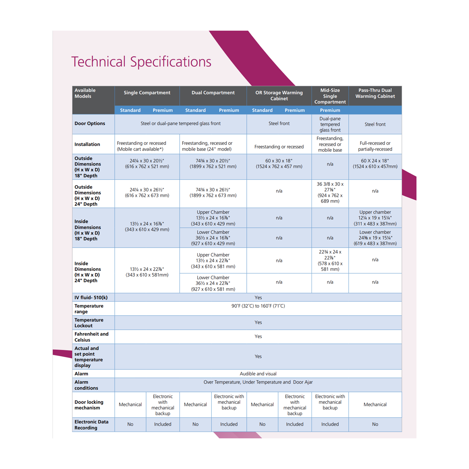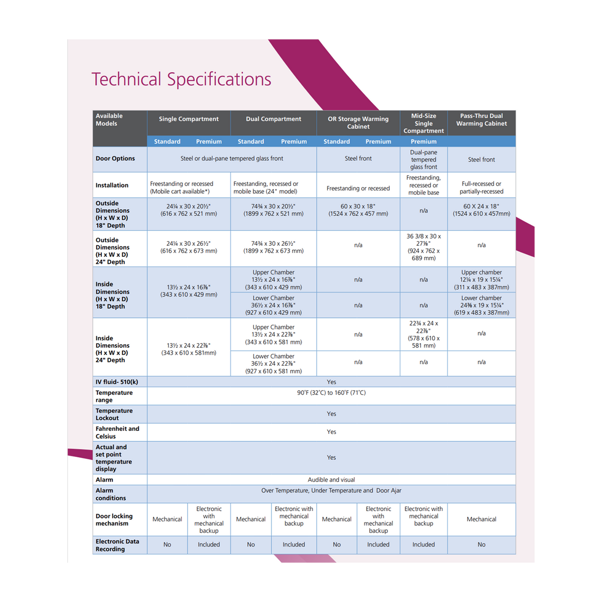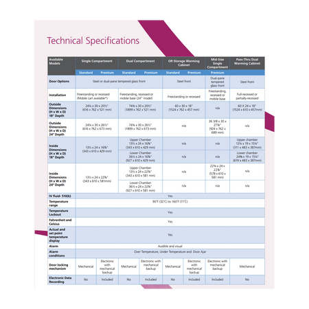 The Steris / Amsco QDJ06 is a dual-compartment warming cabinet designed to meet various warming and storage needs within the operating room. It serves as a blanket warmer and also functions as a warmer and storage container for sterile IV fluids and irrigation supplies. The QDJ06 features an LED readout for instant temperature confirmation, adjustable shelving for flexible organization and storage, reliable heating with uniform and efficient heat transfer, and visual access to inventory with dual-pane tempered glass or traditional solid steel doors. It also offers temperature lock-out for consistency and control, Celsius and Fahrenheit selection for convenience and accuracy, and can be installed as a free-standing or recessed unit.