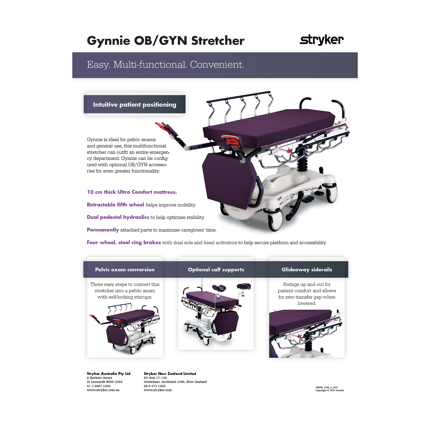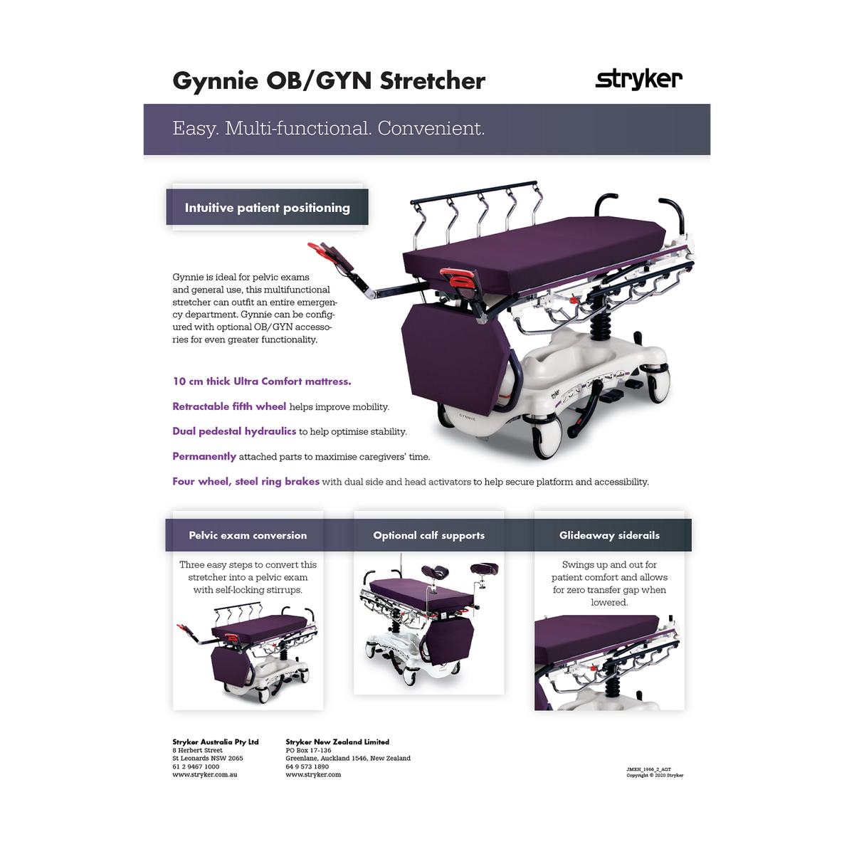 The Gynnie seamlessly integrates the distinctive resilience and characteristics of a typical Stryker stretcher with exceptional functionality tailored specifically for OB/GYN purposes. Specifically designed to facilitate pelvic examinations and provide versatile usage, this multifaceted stretcher is perfectly suited to equip an entire Emergency Department with its comprehensive capabilities.