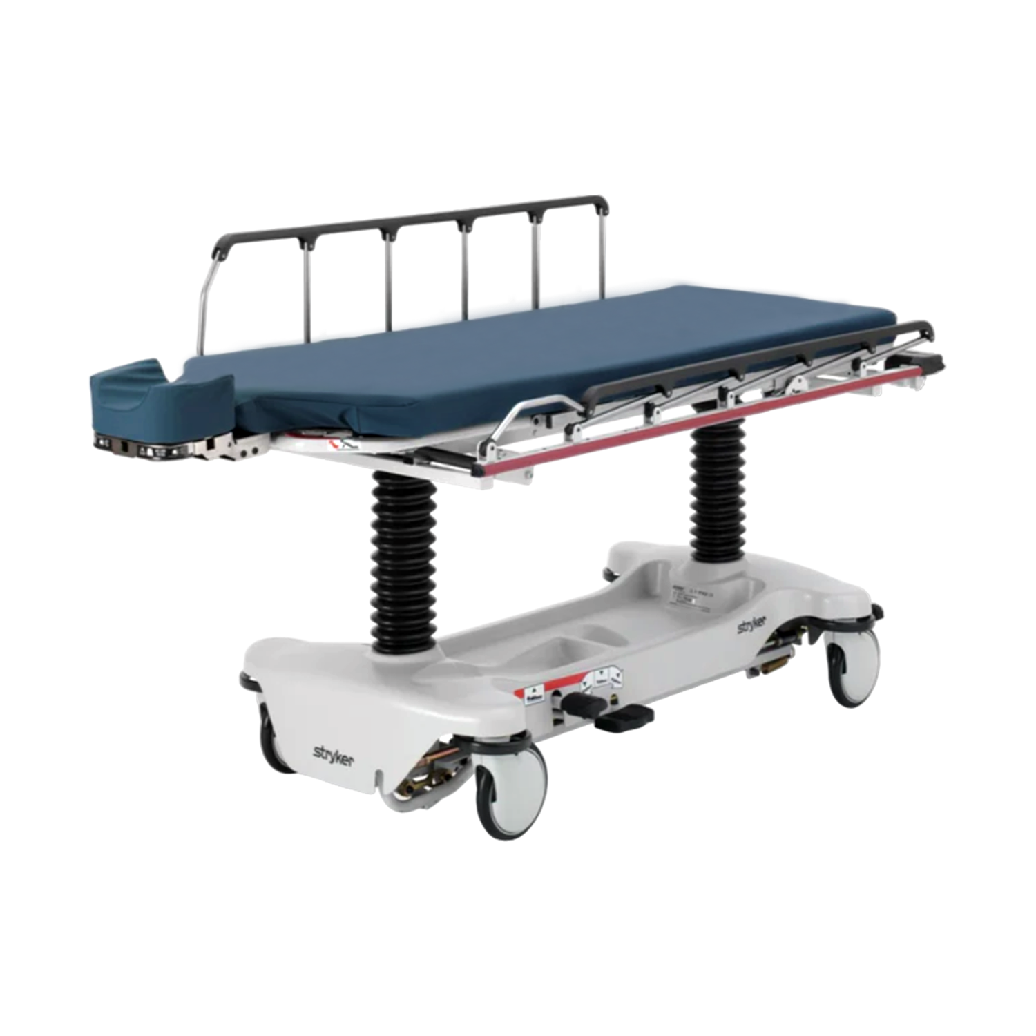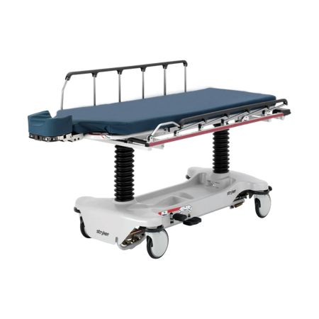 The Stryker 1069 Stretcher is well-suited for both superior and temporal approaches, with positioning controls neatly tucked within the headpiece, allowing full articulation. It offers enhanced clearance and a dual-articulating headpiece to maximize surgical access. The stretcher also features a flexible tube that serves as both air delivery and drape support, dual cylinder pneumatic backrest, dual pedestal hydraulics, and dual side hydraulic controls. Additionally, it includes fold-down siderails, four IV receptacles, and a four-wheel steel-ring braking system with a foot-end brake and steer pedal. The stretcher's design prioritizes accessibility for surgeons and patient comfort, making it an ideal choice for delicate eye surgery procedures.