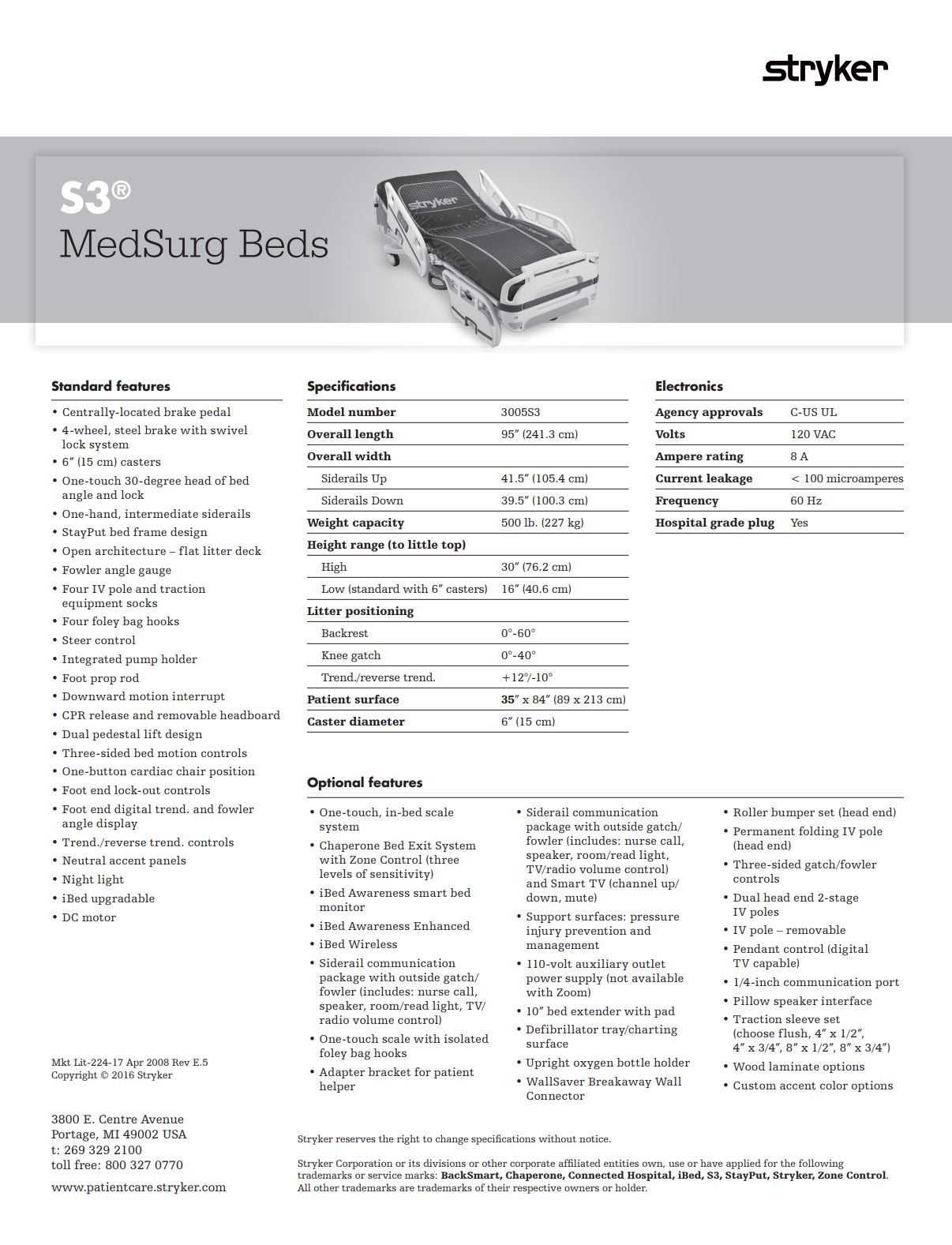 The Stryker 3005 S3 Med-Surg Bed is a highly advanced and versatile hospital bed designed to enhance patient care and operational efficiency in healthcare facilities. The bed features a transition from AC motors to DC motors and actuators, as well as a change to a blow-molded headboard. This transition also involved changes to the CPU board, power supply, and bed cables. The bed is designed to provide a comprehensive and advanced solution for patient care and operational needs, with features such as StayPut Technology, iBed Awareness, intermediate support position siderails, customization options, and connected hospital integration.