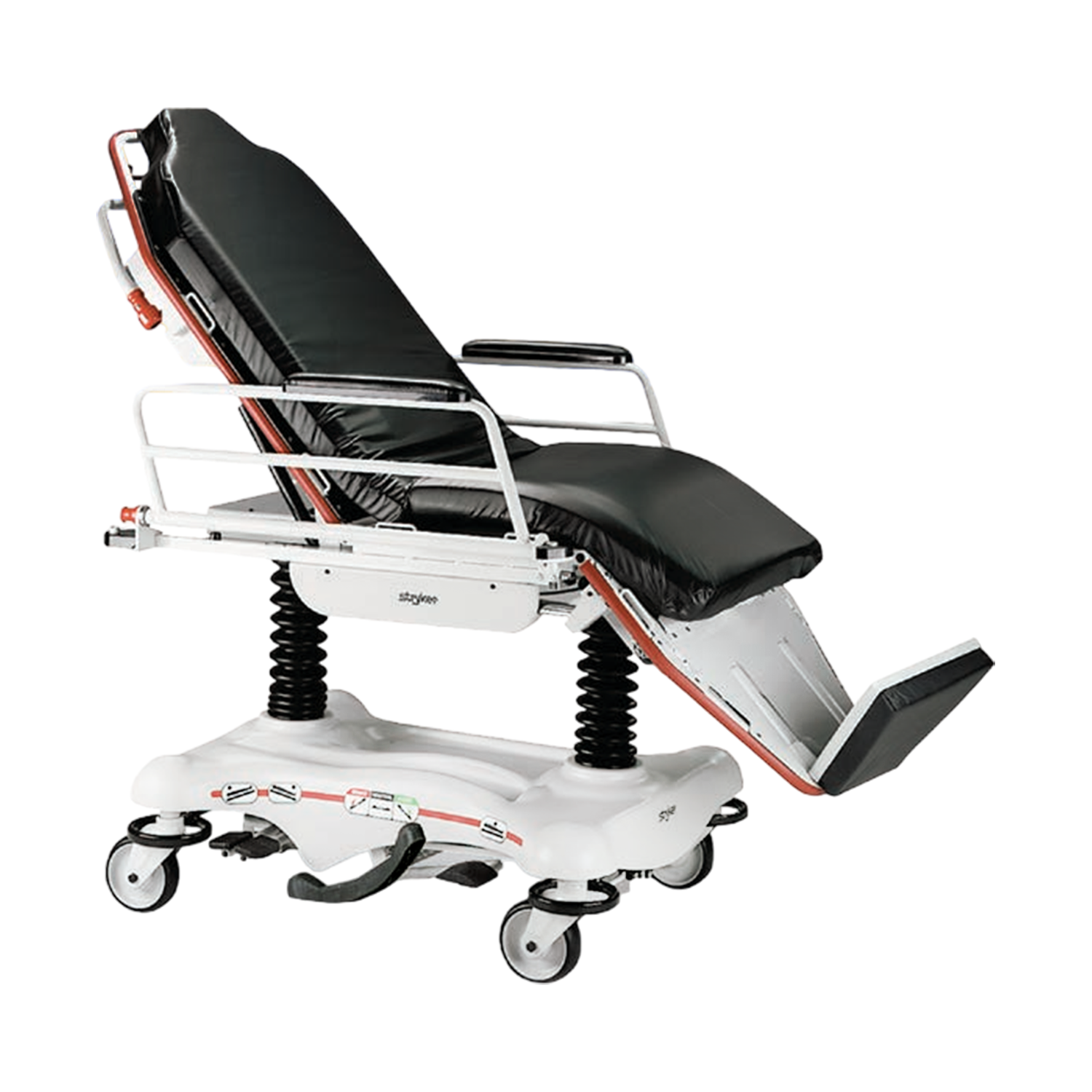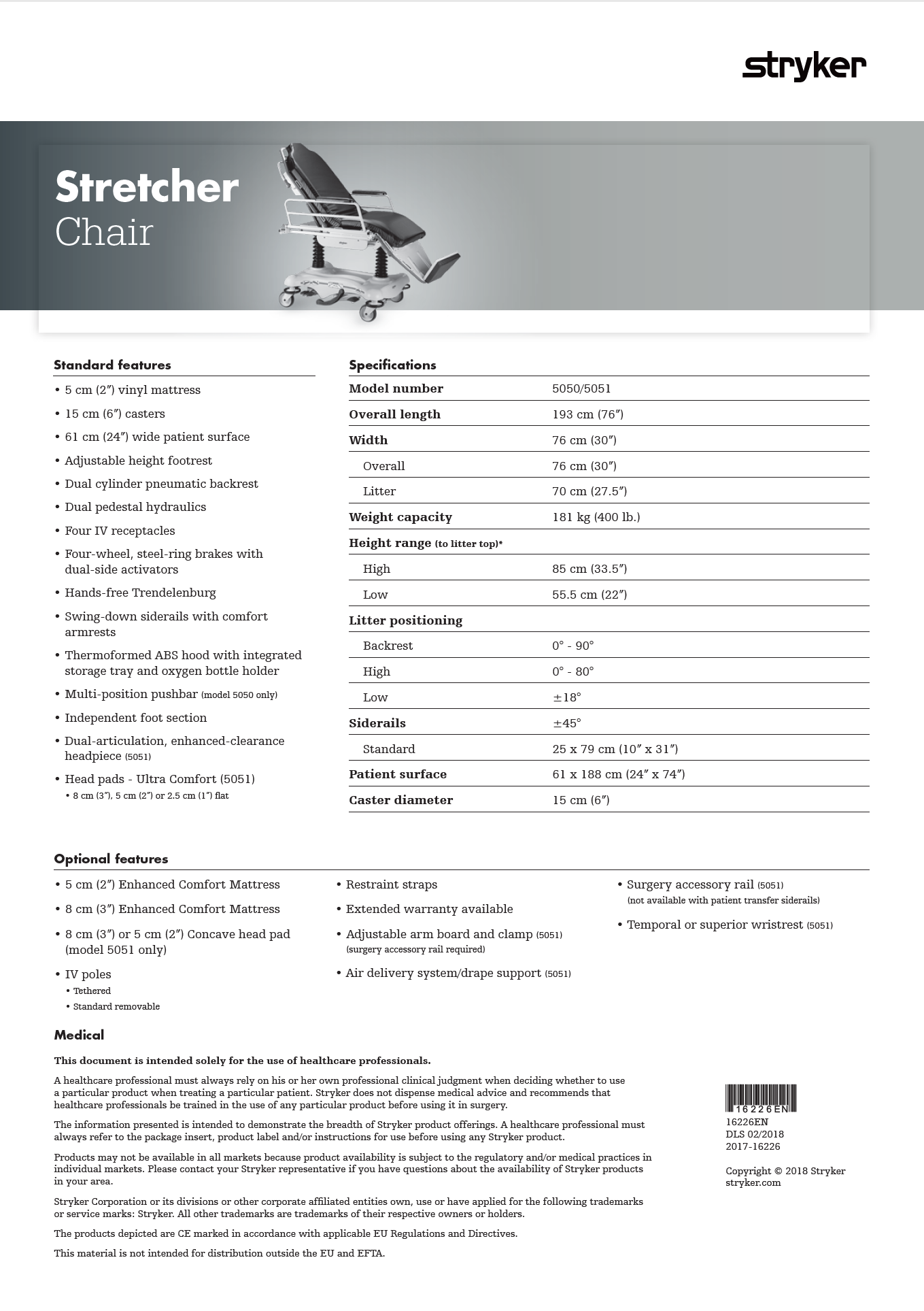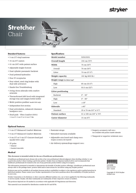 The Stryker 5050 Eye Stretcher Chair is a versatile medical device that serves multiple functions, offering stability, ease of use, comfort, mobility, and safety. It can be positioned from a flat horizontal stretcher to a chair position, making it ideal for surgery centers and small spaces, and maximizing patient throughput. The chair features a durable design, with a weight capacity of 400 lbs (182 kg), and includes a new mattress pad and foot pad. The twin jacks allow the Model 5050 to be placed in a comfortable "recliner" position, and the foot section can be moved dependently or independently of the backrest.