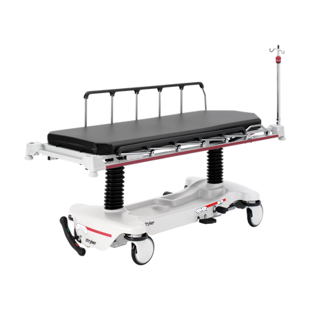 The Stryker 734 is a versatile transport stretcher designed for general purpose, transport, and procedures. It is a basic multi-purpose hydraulic stretcher that offers flexibility and ease of use. The Stryker 734 features a wide patient surface, dual cylinder pneumatic backrest, and a unilower pedal that adjusts for improved accessibility. It also includes convenient Glideaway siderails, four-wheel steel-ring brakes with dual end activators, and hands-free Trendelenburg. The stretcher is designed to provide stability, ease of movement, and a weight capacity of 500 lbs.