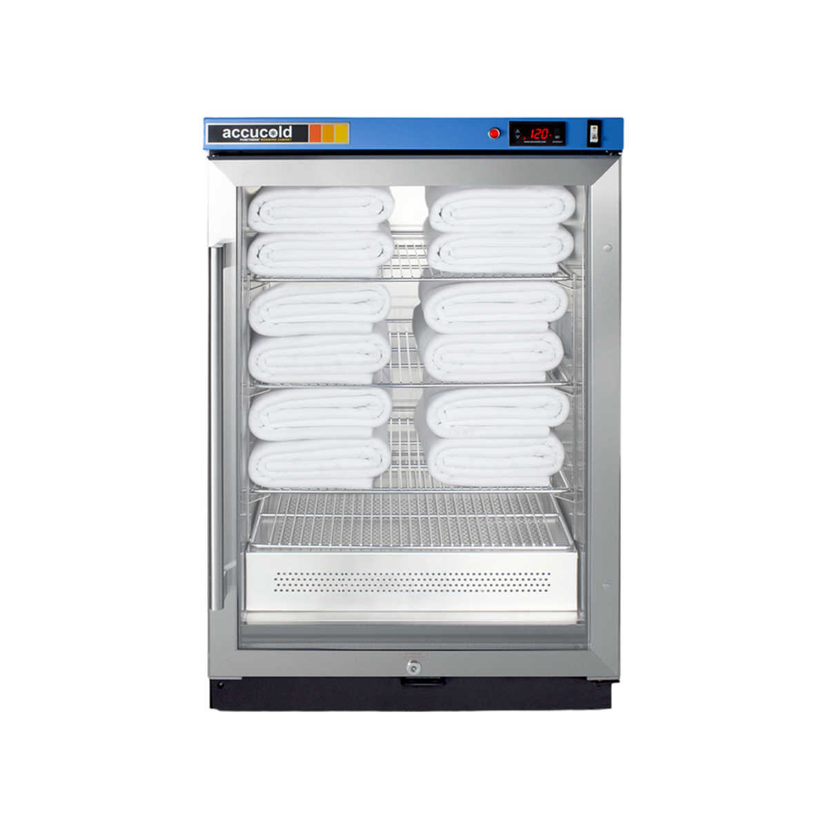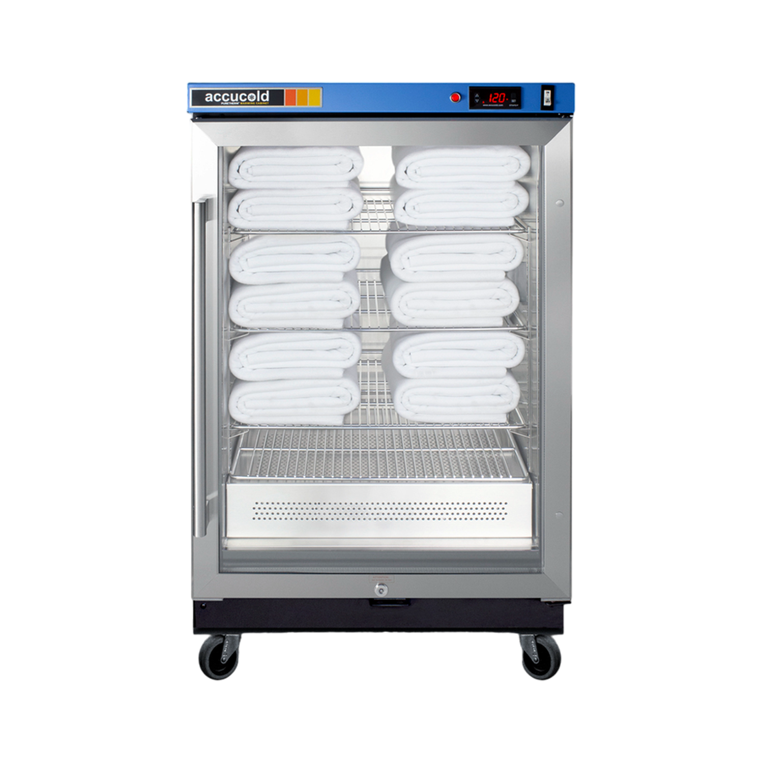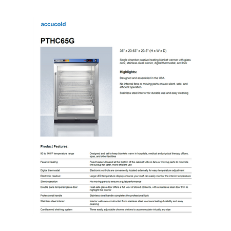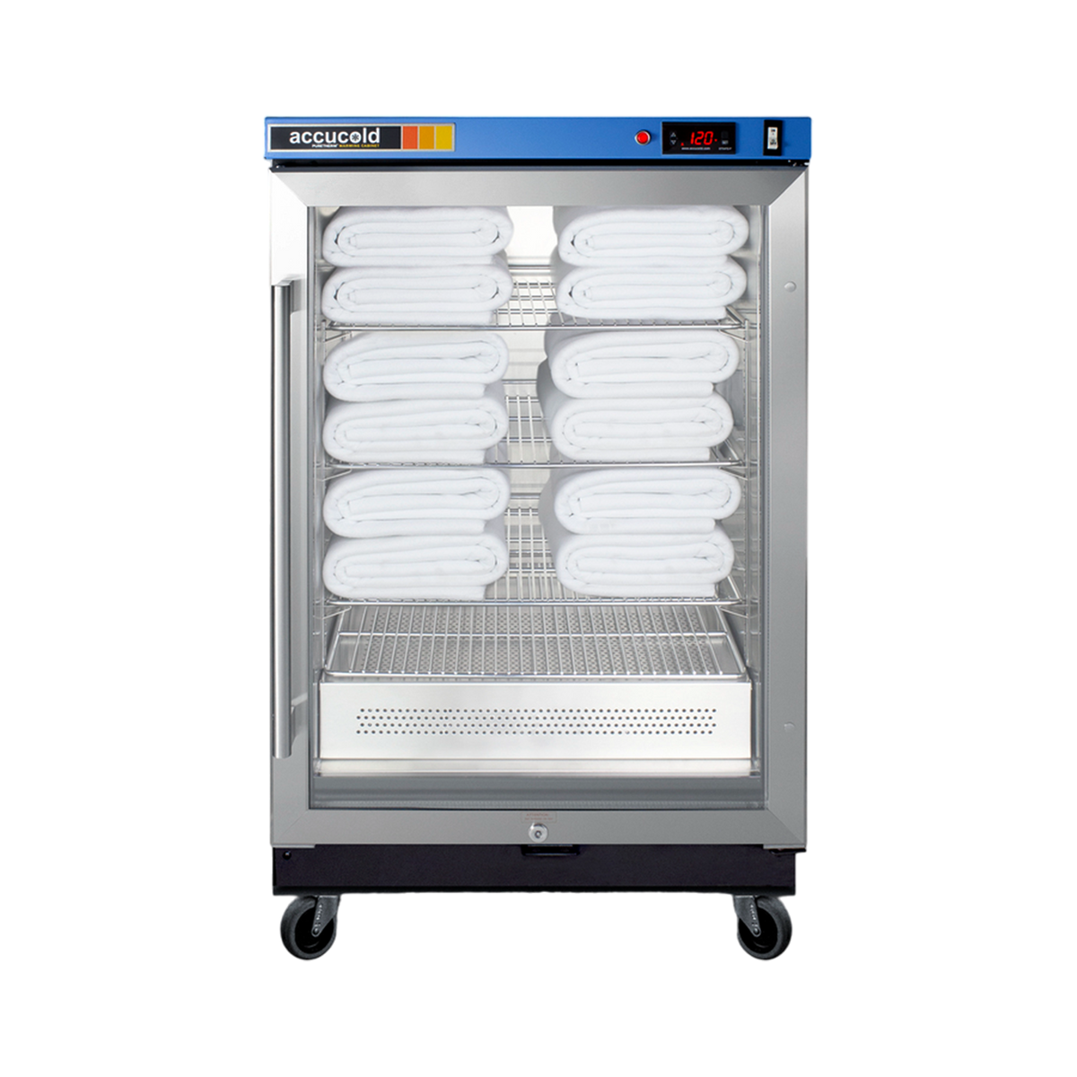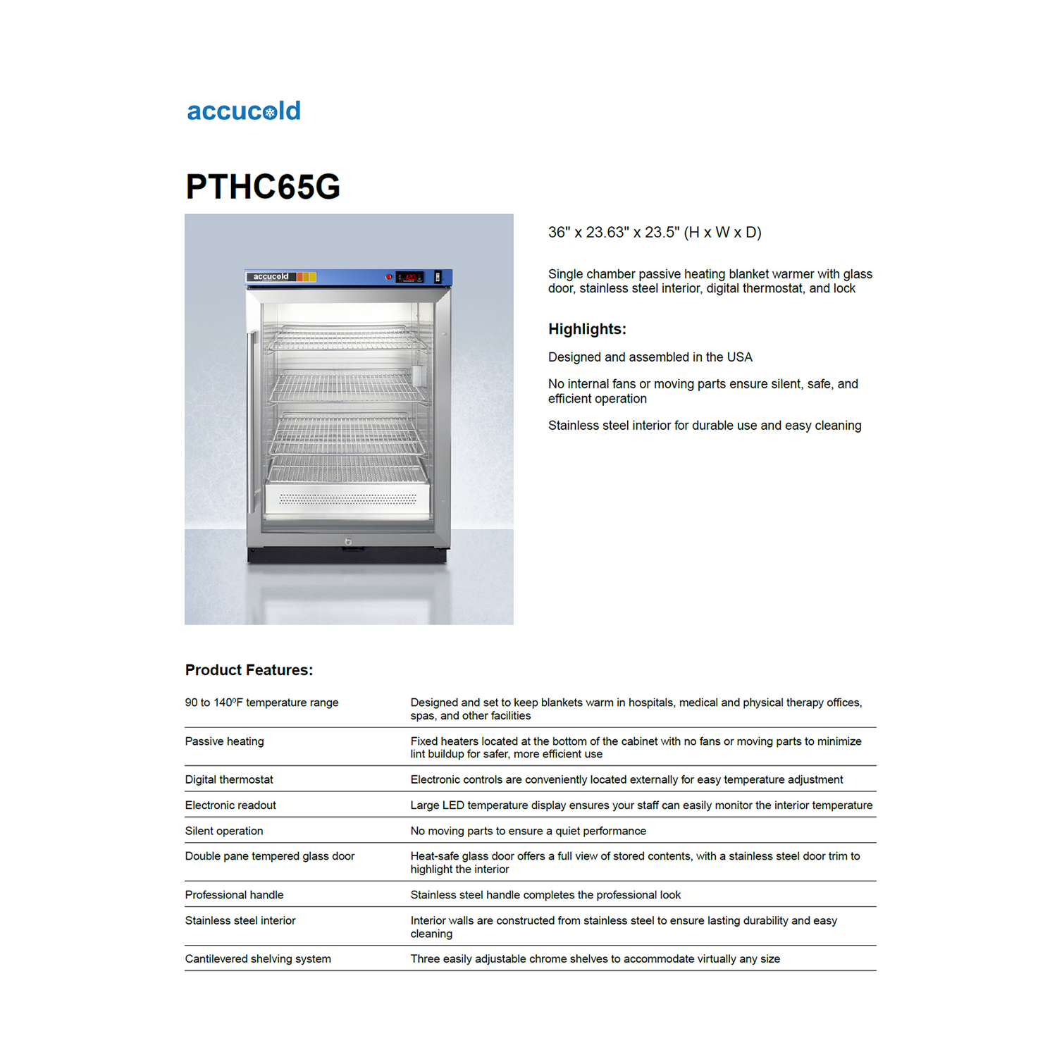 The Accucold PureTherm Blanket Warmer offers a 4.57 cu. ft. capacity and is equipped with digital controls, allowing for precise temperature management within the range of 90°-140°F. It utilizes passive heating technology to maintain the desired temperature, ensuring that blankets and linens are kept warm and ready for use.