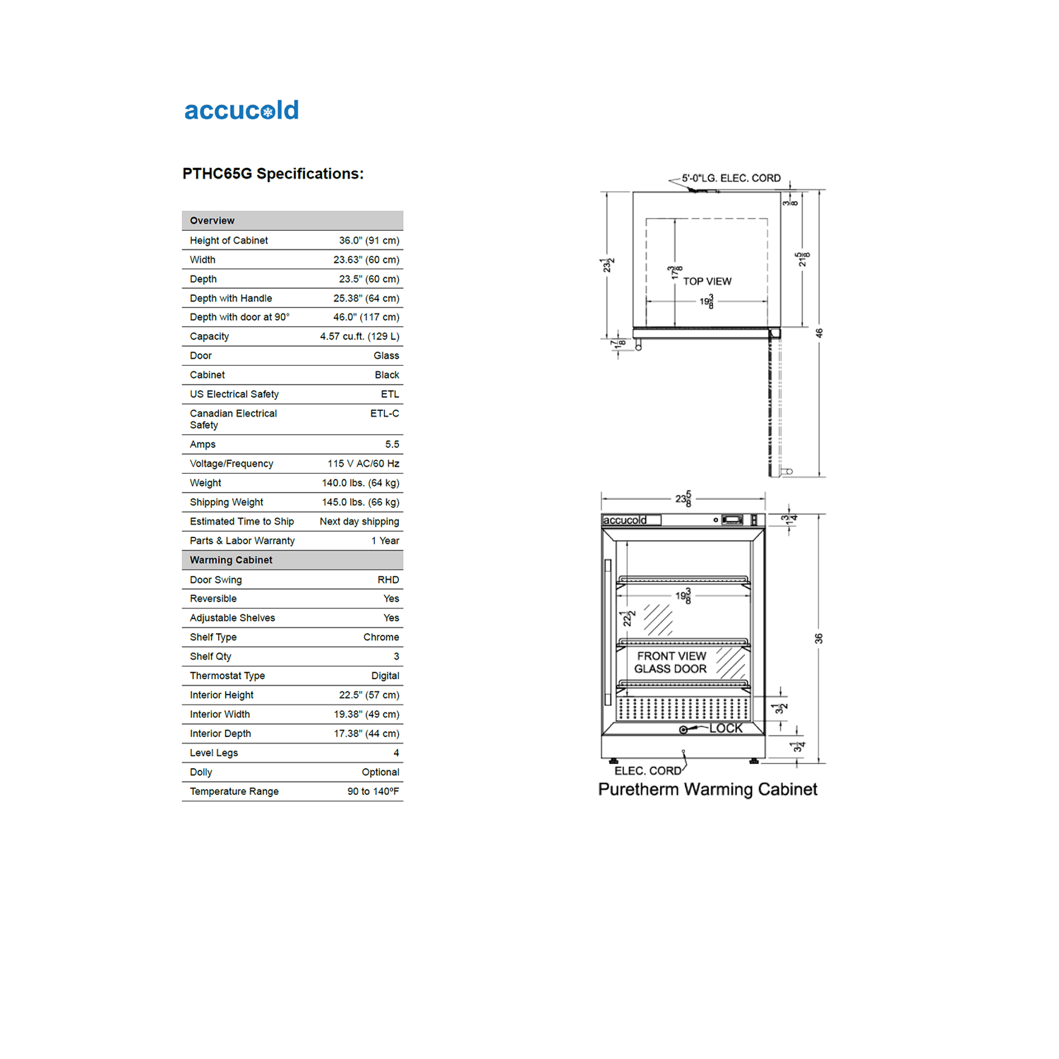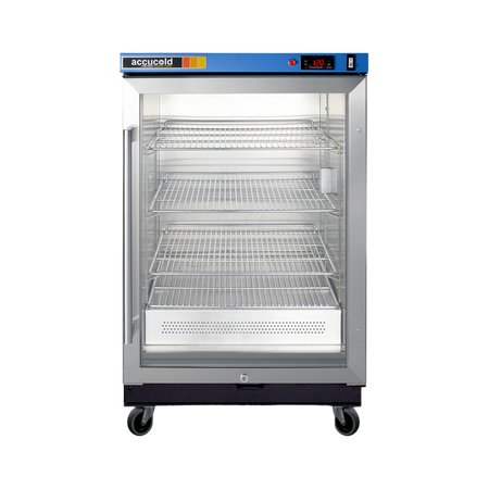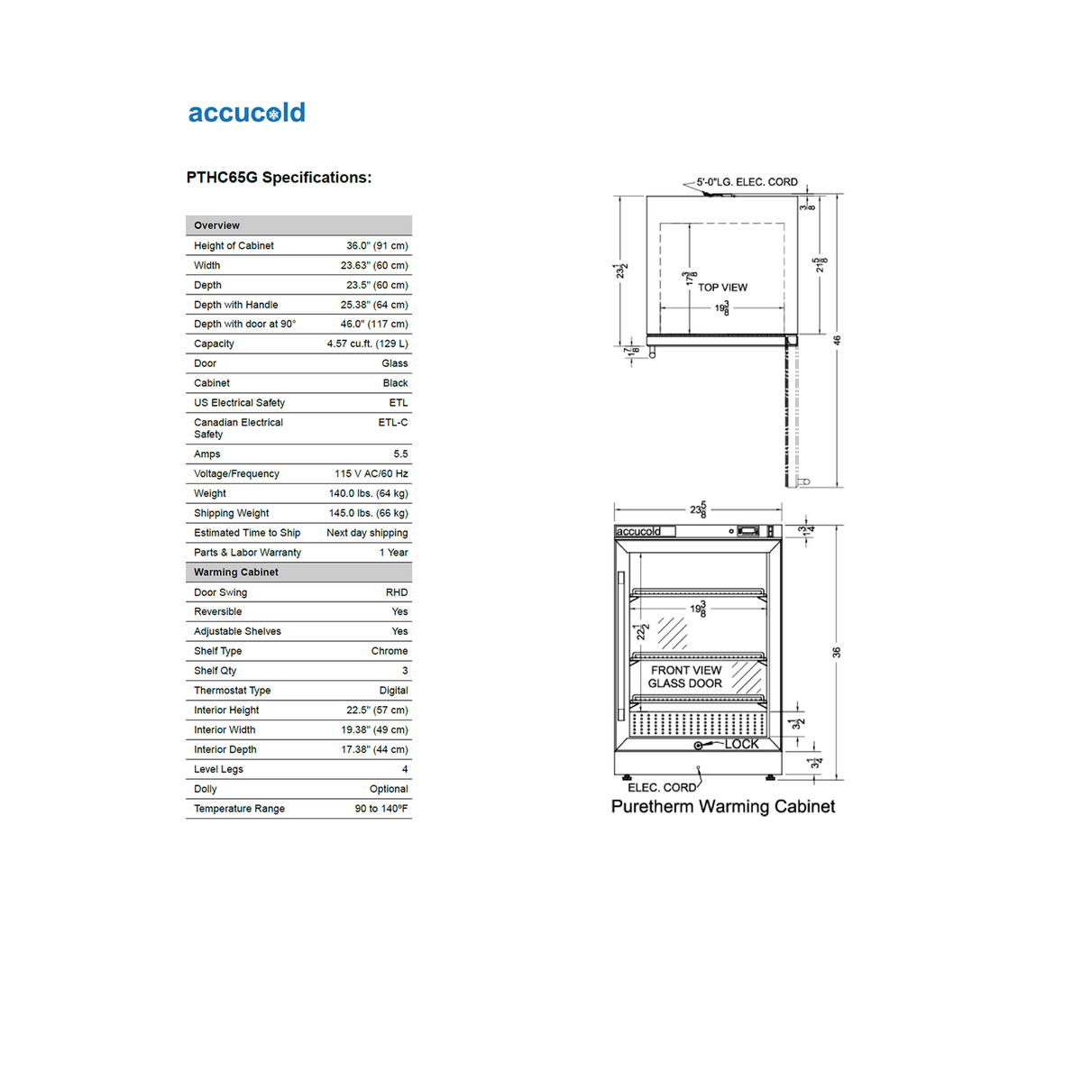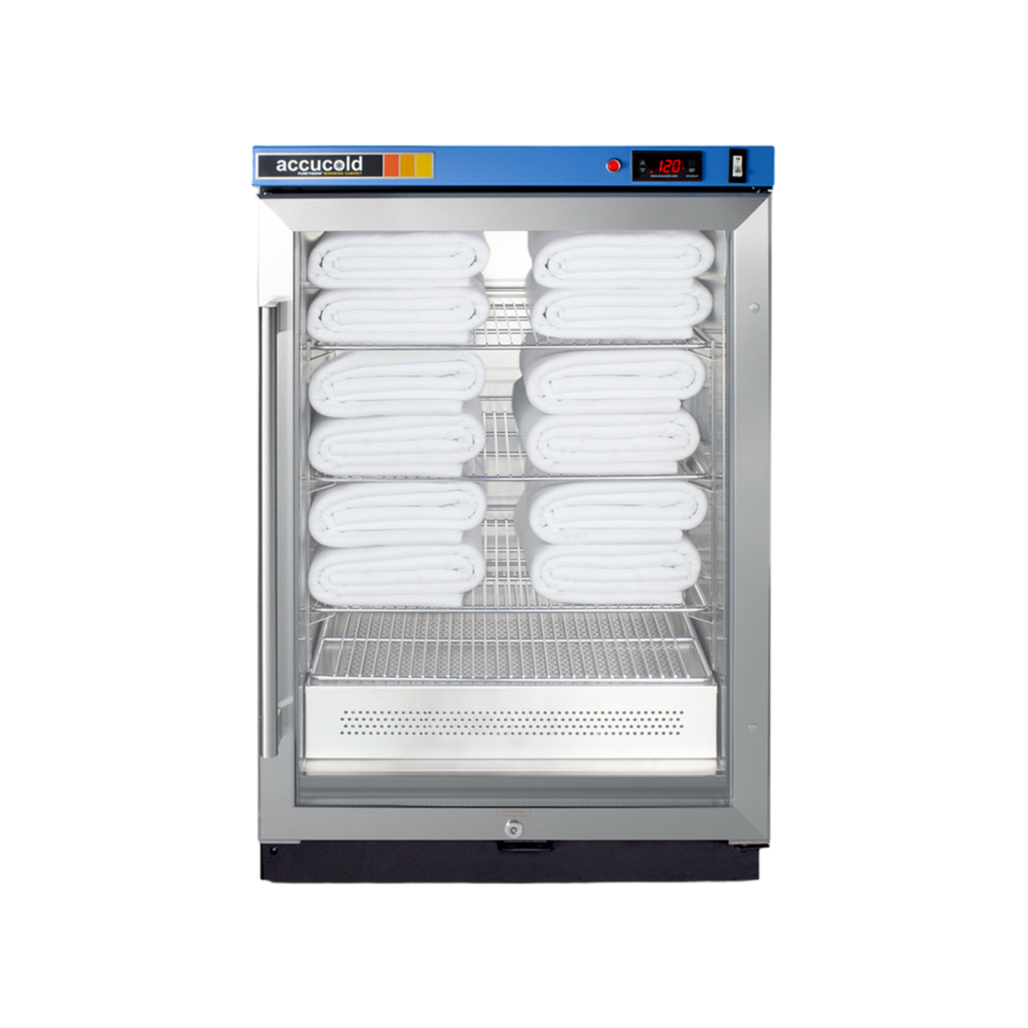 The Accucold PureTherm Blanket Warmer offers a 4.57 cu. ft. capacity and is equipped with digital controls, allowing for precise temperature management within the range of 90°-140°F. It utilizes passive heating technology to maintain the desired temperature, ensuring that blankets and linens are kept warm and ready for use.