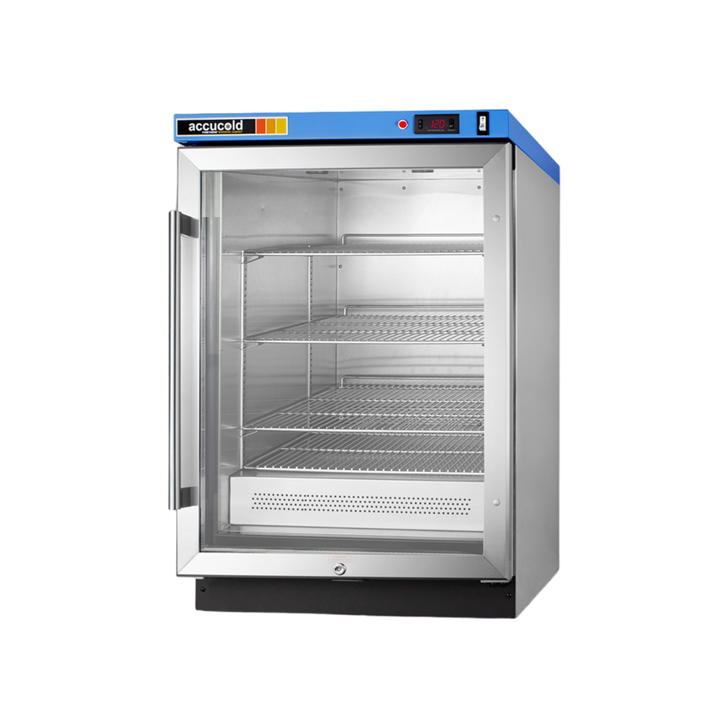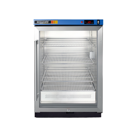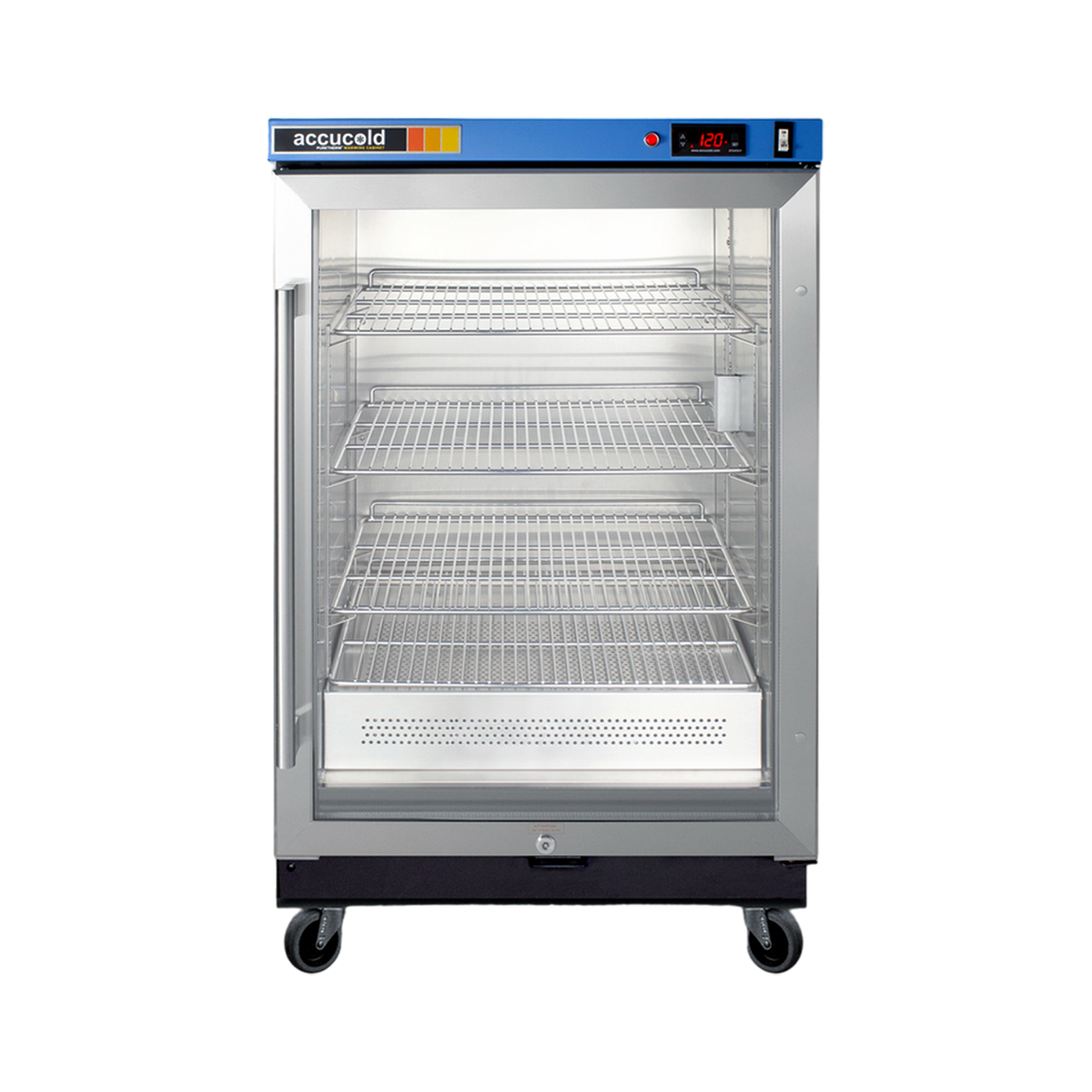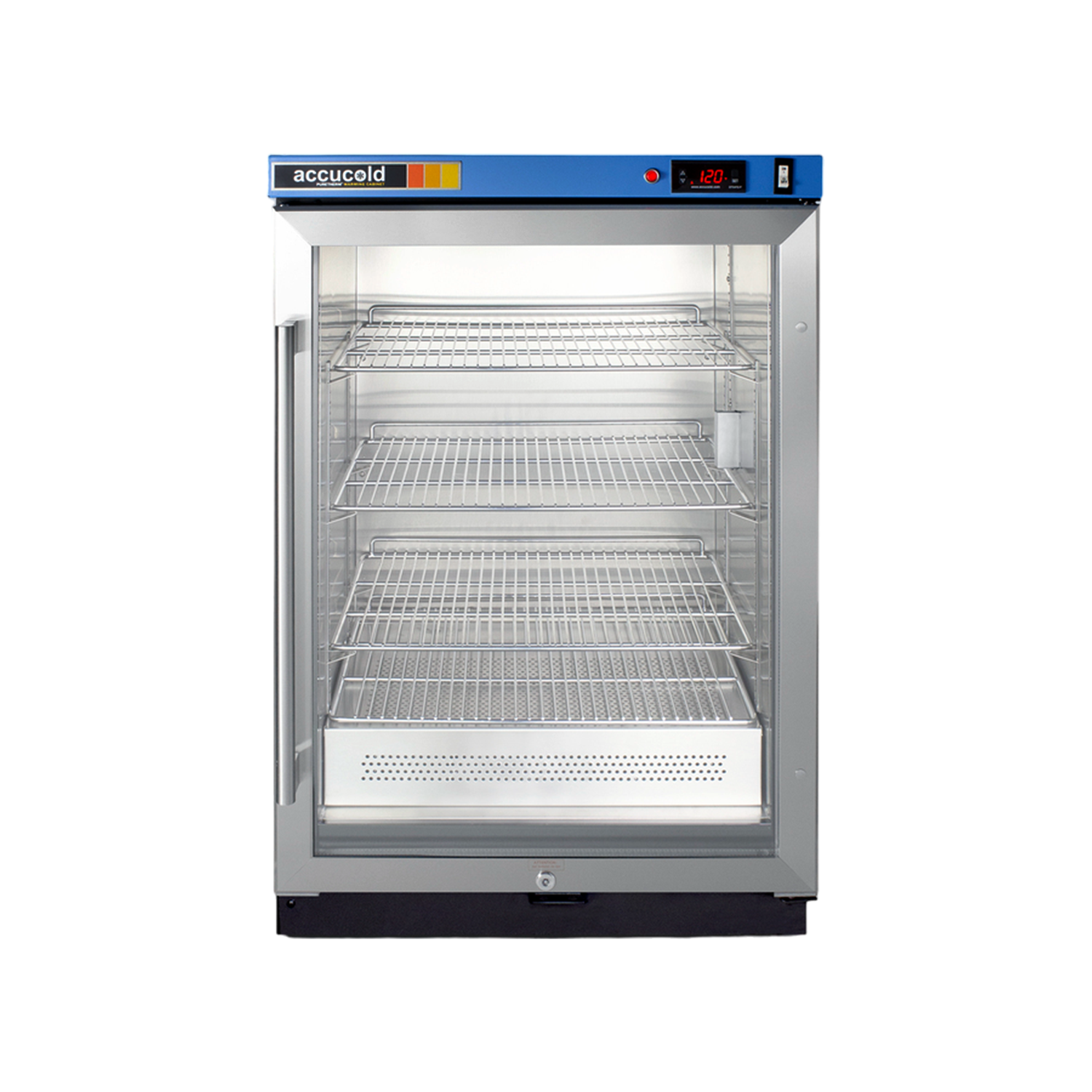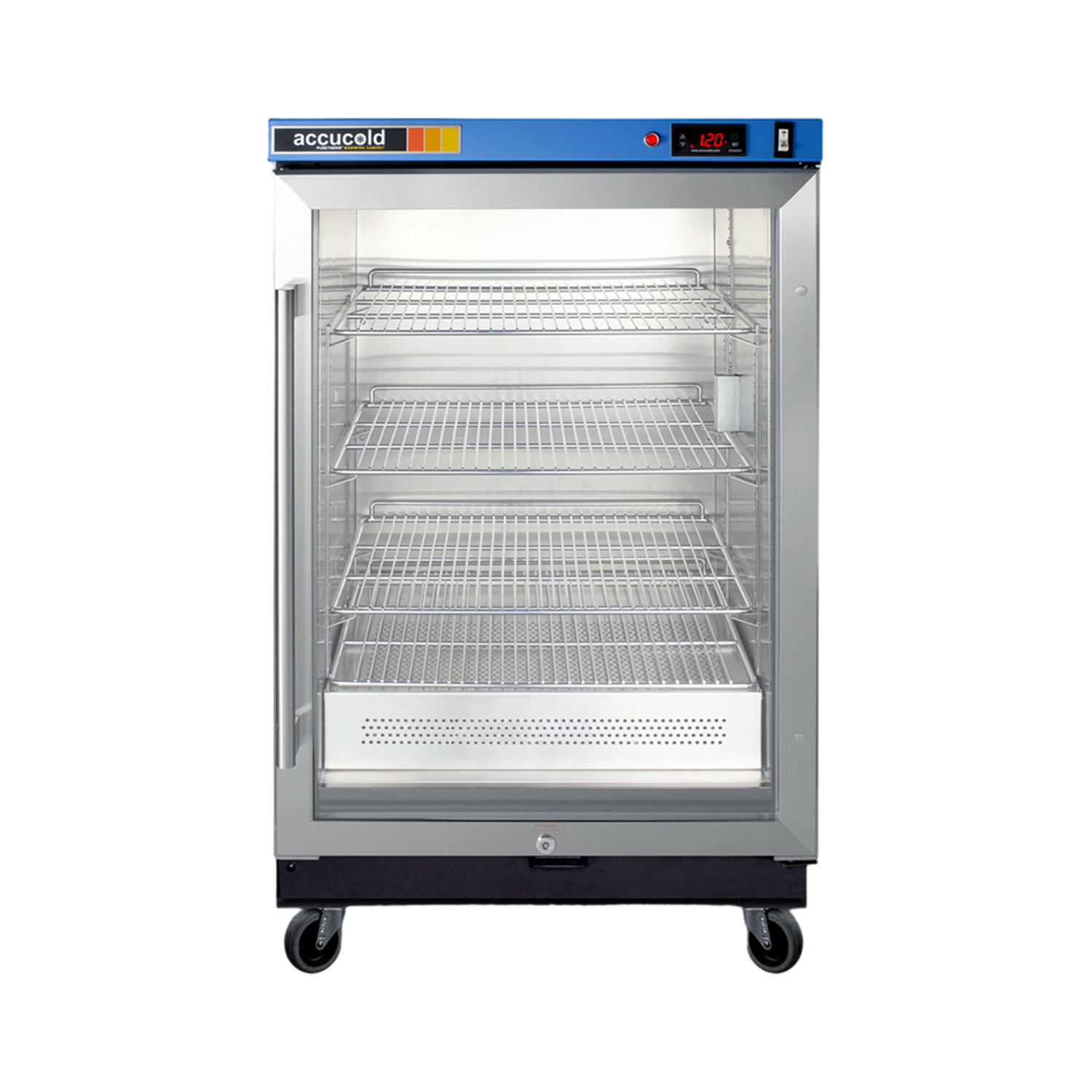 The Accucold PureTherm Blanket Warmer offers a 4.57 cu. ft. capacity and is equipped with digital controls, allowing for precise temperature management within the range of 90°-140°F. It utilizes passive heating technology to maintain the desired temperature, ensuring that blankets and linens are kept warm and ready for use.