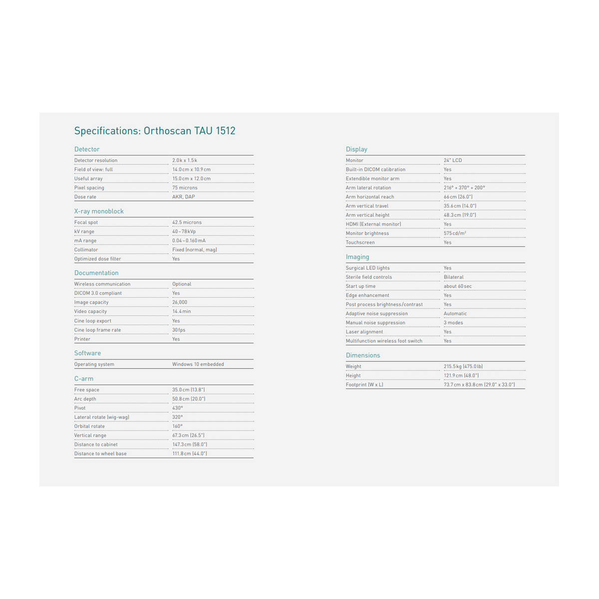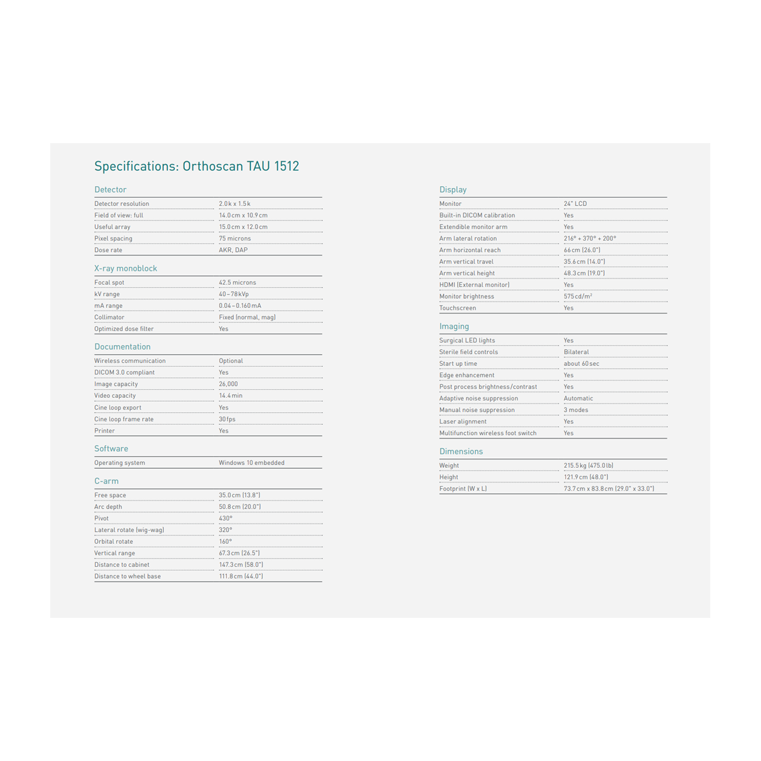 These features collectively make the Orthoscan TAU 1512 an advanced and user-friendly mini C-arm solution, suitable for various medical imaging applications.