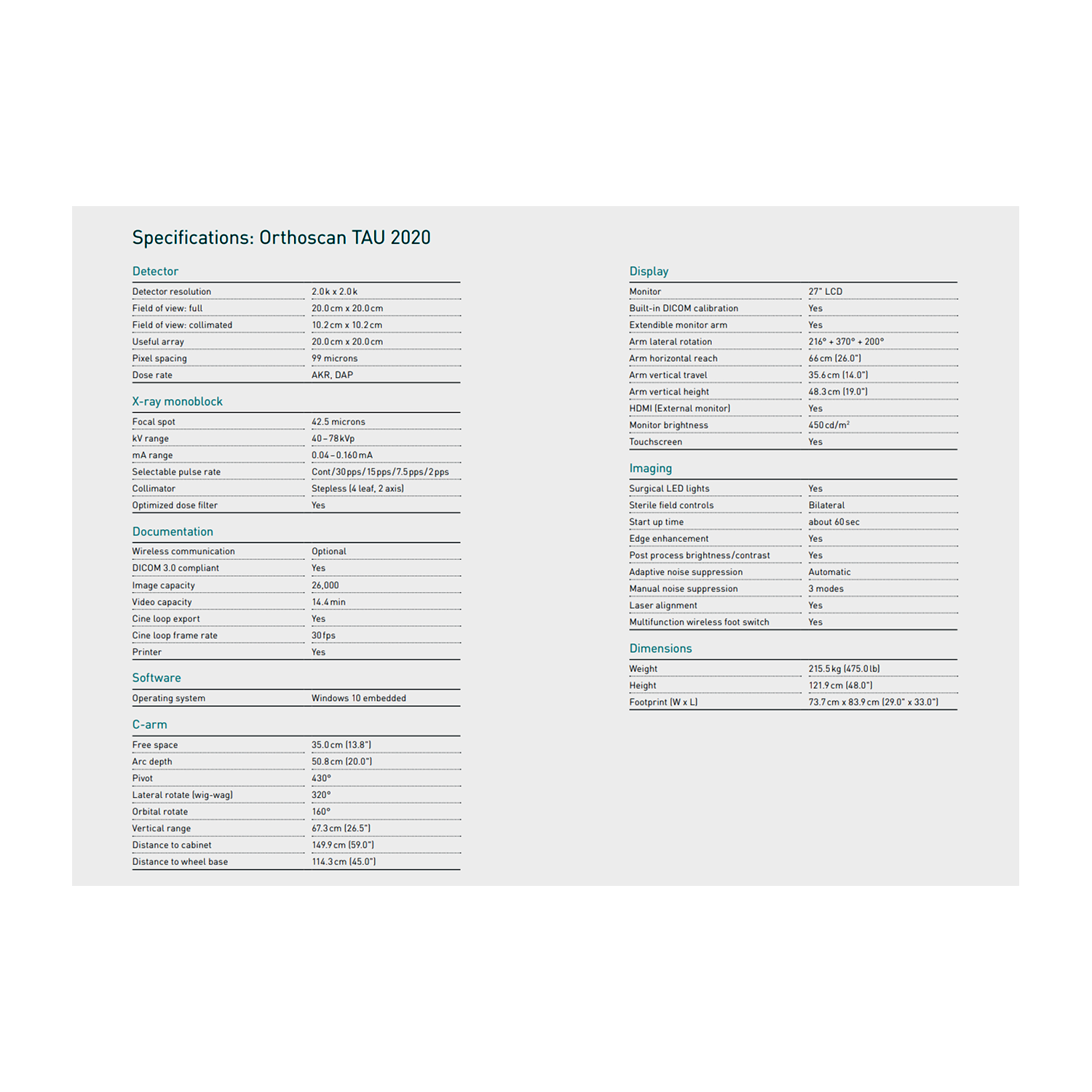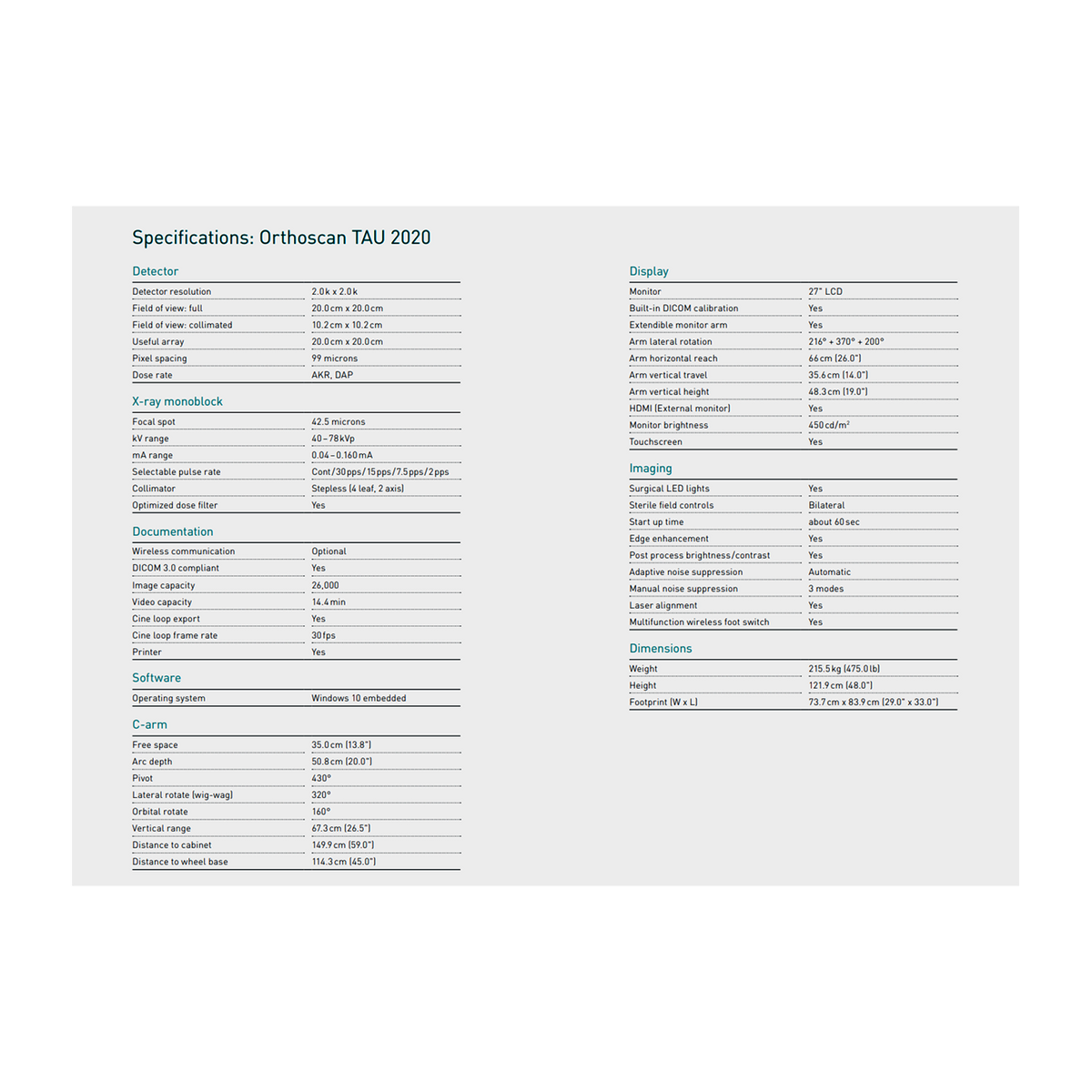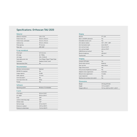 These features collectively make the Orthoscan TAU 2020 an advanced and user-friendly mini C-arm solution, suitable for various medical imaging applications.