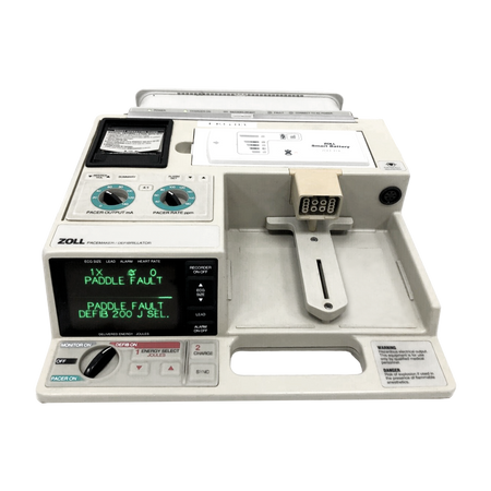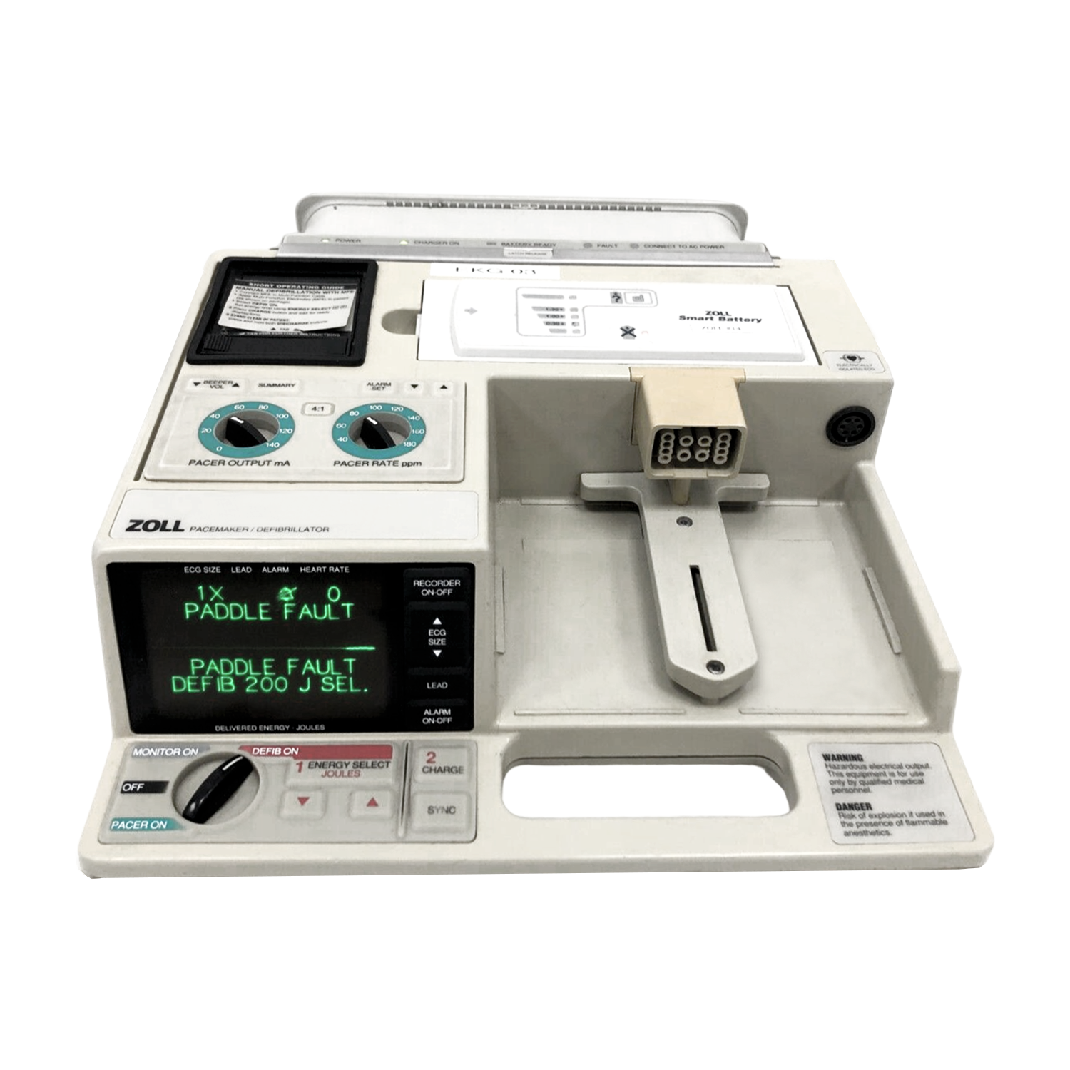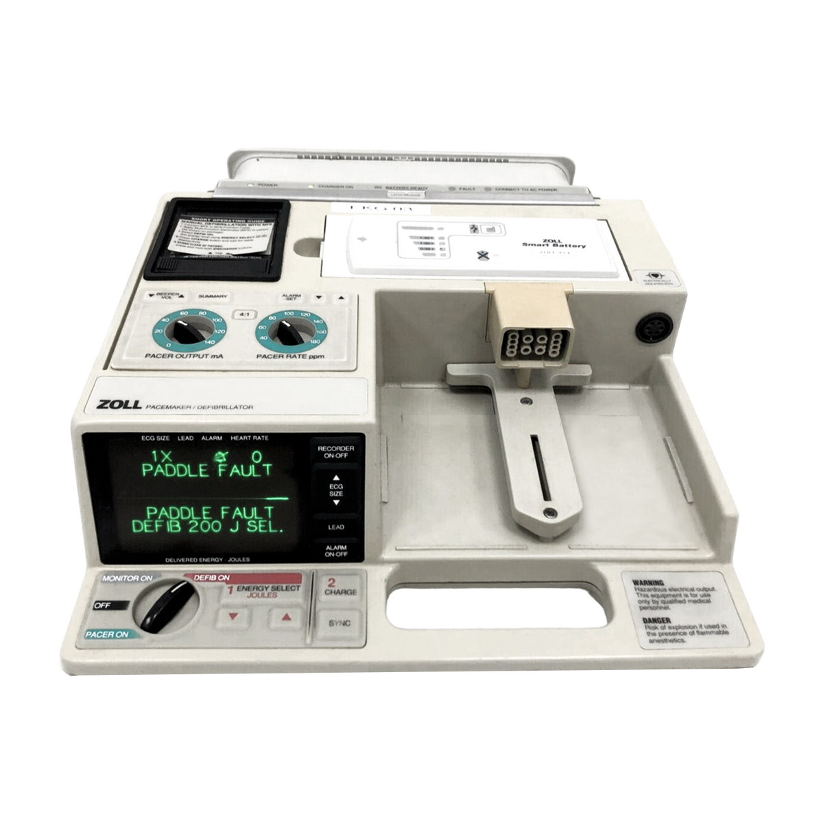 - Can be operated either with ZOLL "hands-off" multi-function Electrodes or with standard defibrillation paddles and pacing electrodes.